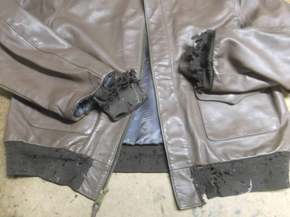 9枚目はA-2フライトジャケットから両袖と腰回りのリブニットを取り外した写真です。