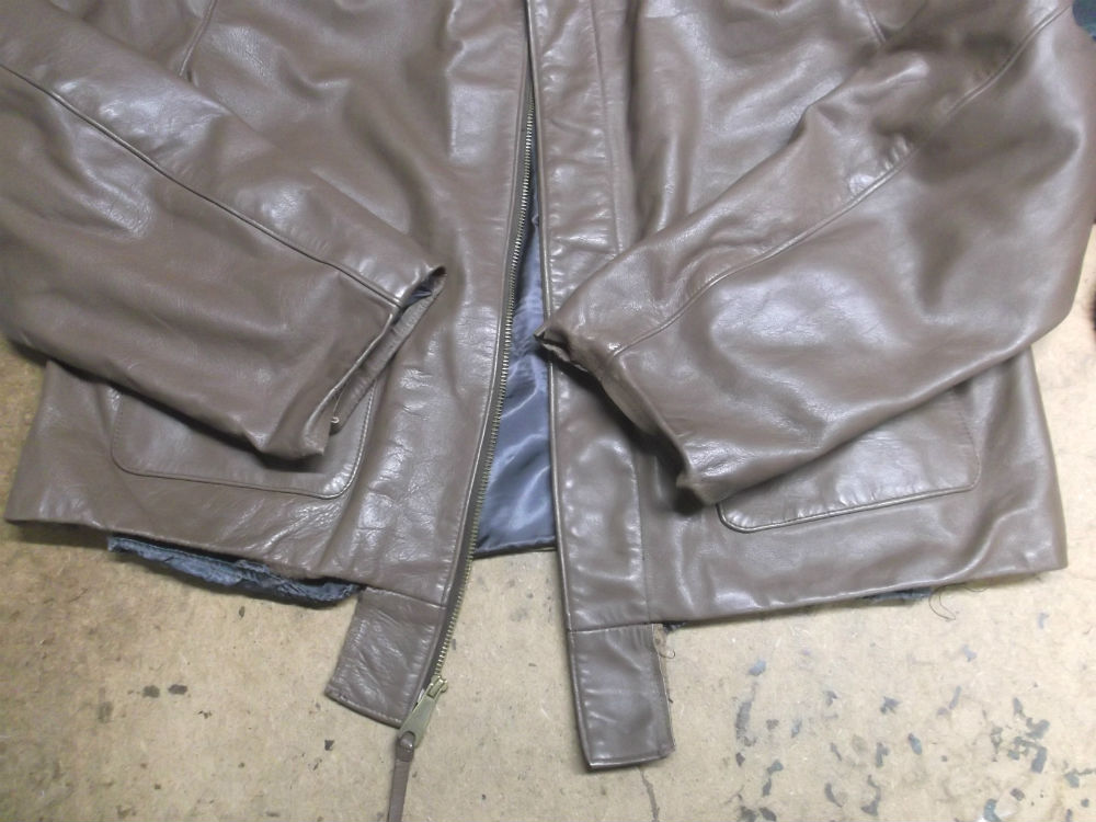 1枚目は徳島県からの郵送のお客さんの両袖と腰回りのリブニットを交換していく前のA-2フライトジャケットです。