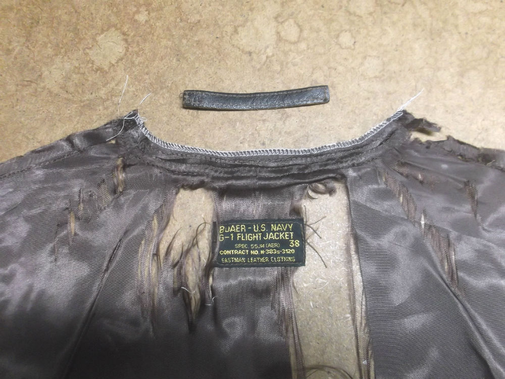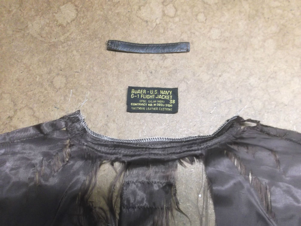 27枚目はタグとループをG-1フライトジャケットに取り付けた襟周りの写真です。