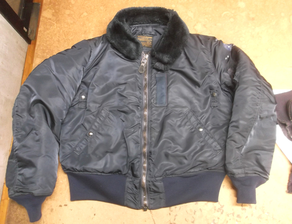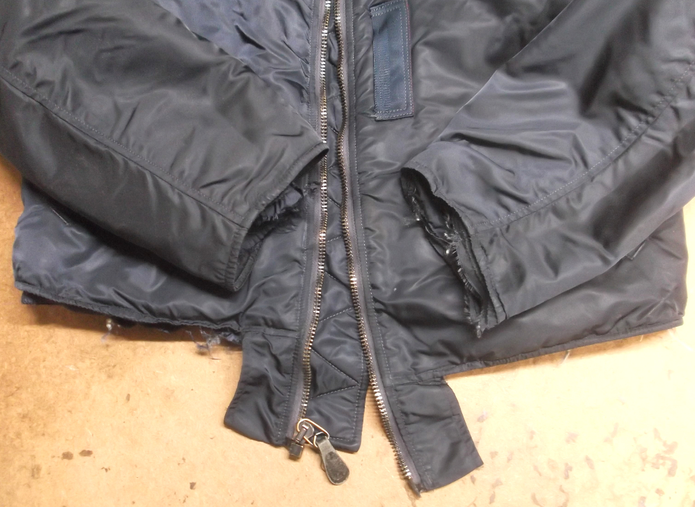 1枚目は香川県からの郵送のお客さんの両袖と腰回りのリブニットを交換していく前のB-15フライトジャケットです。