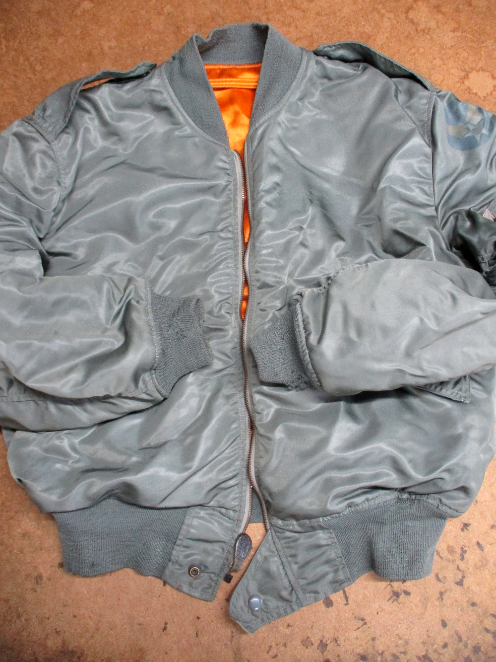 1枚目は滋賀県からの郵送のお客さんの襟、両袖、腰回りのリブニットを交換していく前のL-2Bフライトジャケットです。