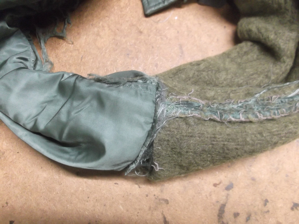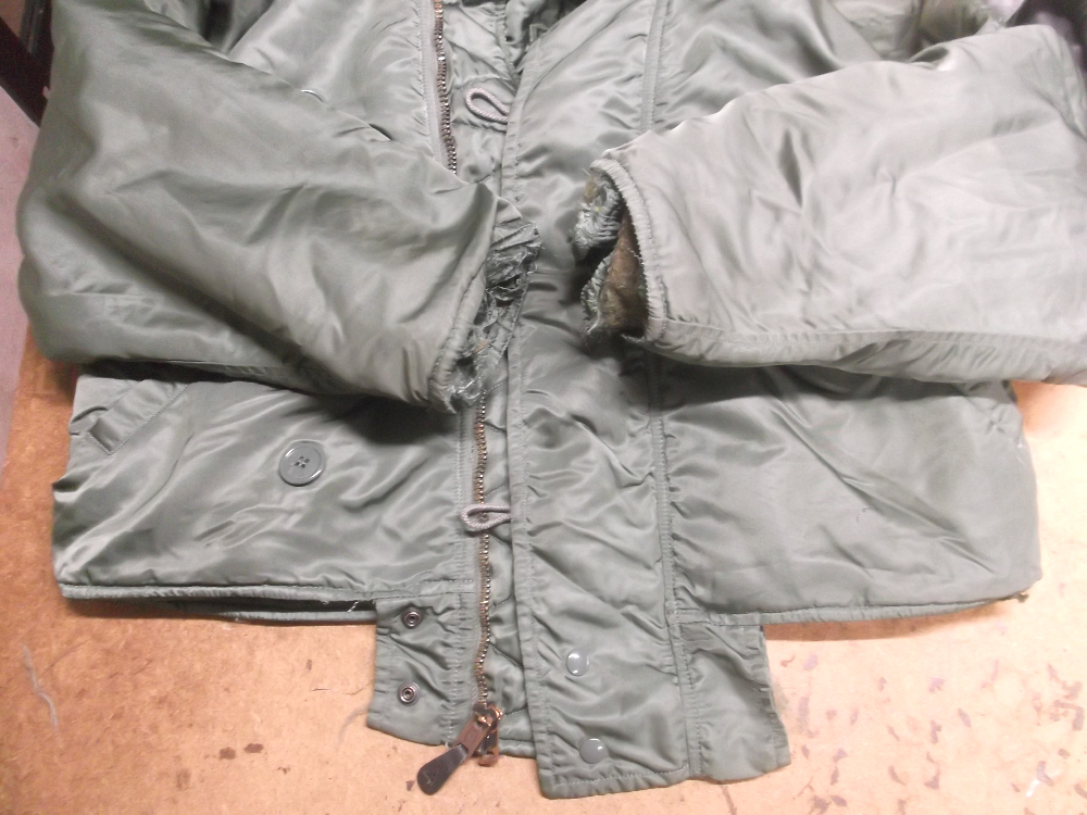 1枚目は長野県からの郵送のお客さんの両袖と腰回りのリブニットを交換していく前のN-2Bフライトジャケットです。