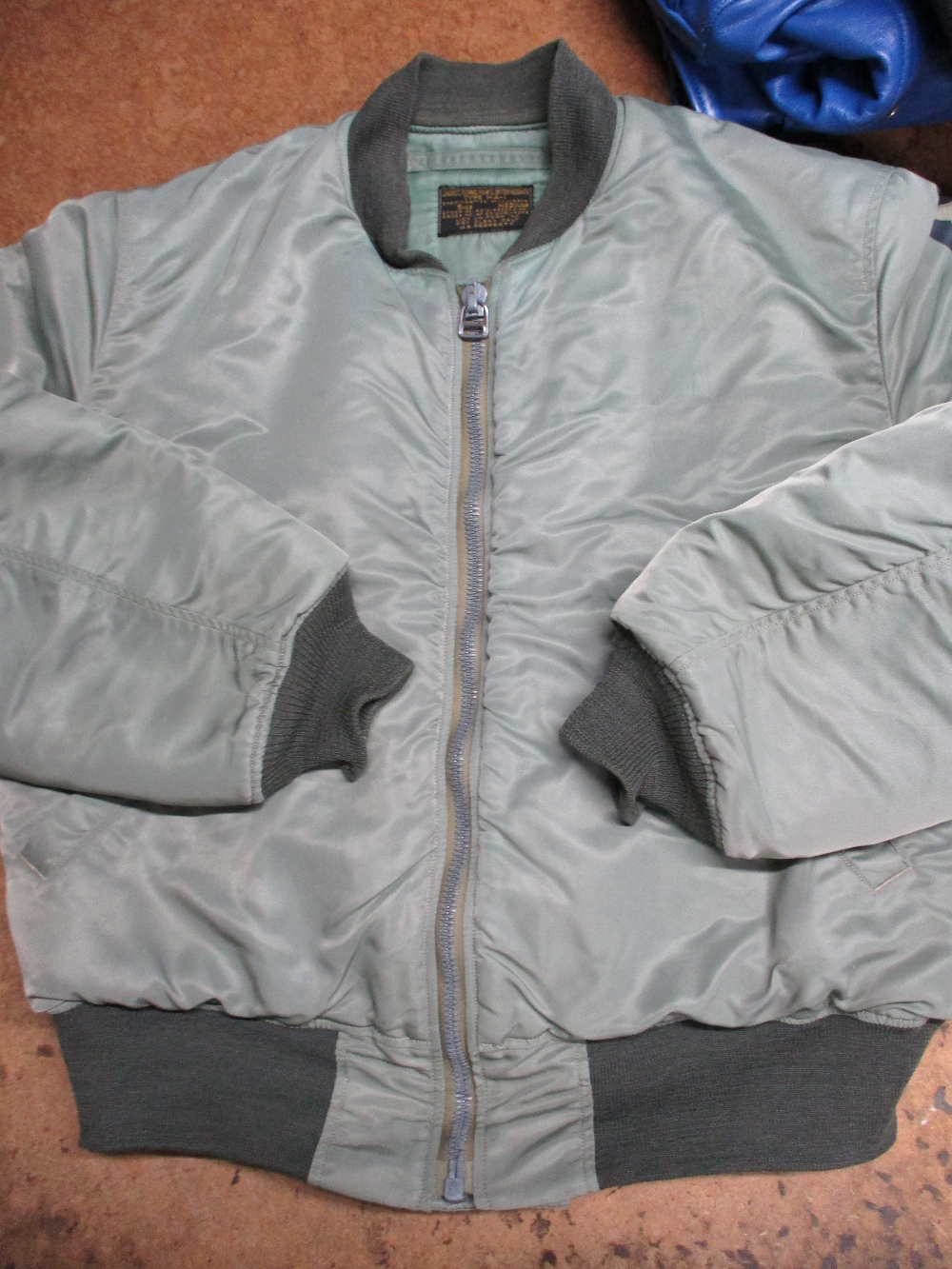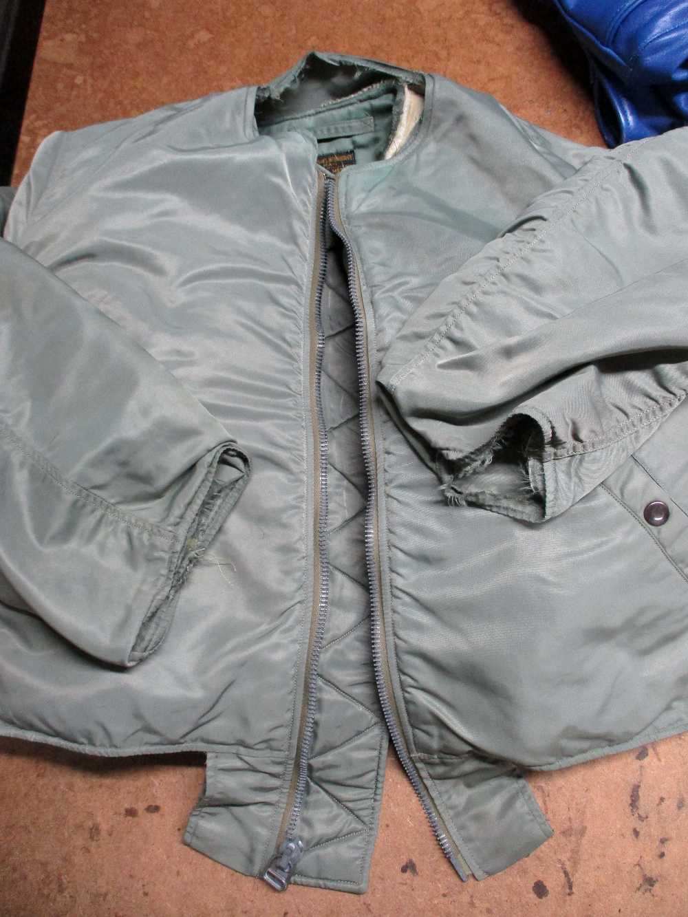 1枚目は東京都からの郵送のお客さんの襟、両袖、腰回りのリブニットを交換していく前のMA-1フライトジャケットです。