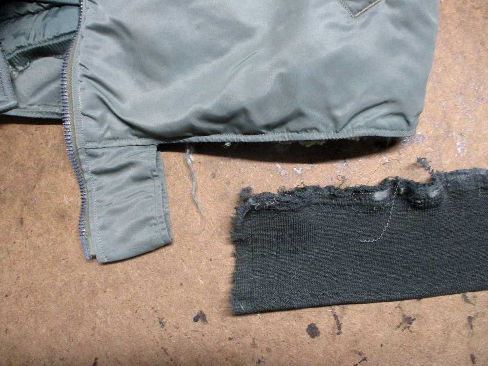 襟、両袖、腰回りのMA-1フライトジャケットのリブニットを新しいものに交換していきます。