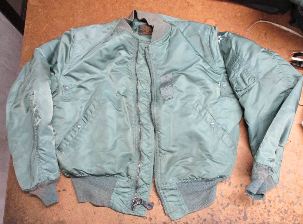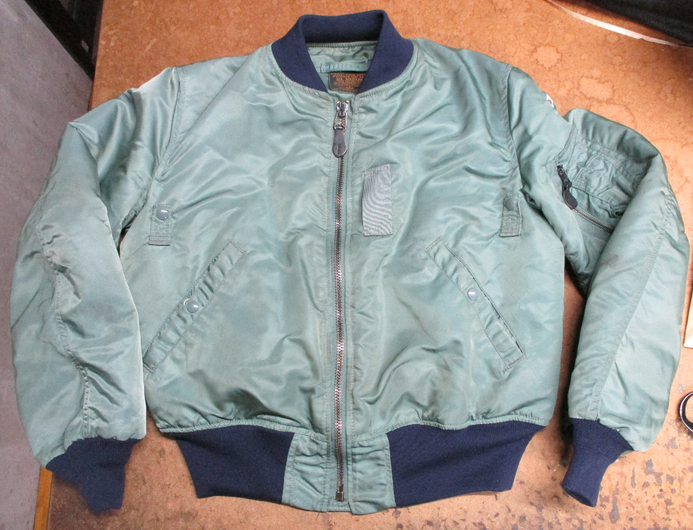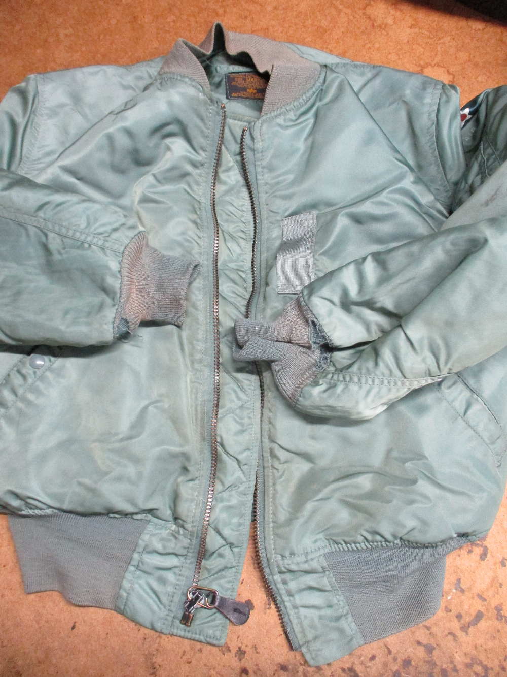 16枚目はMA-1フライトジャケットに新しく襟、両袖、腰回りにリブニットを取り付けた写真です。