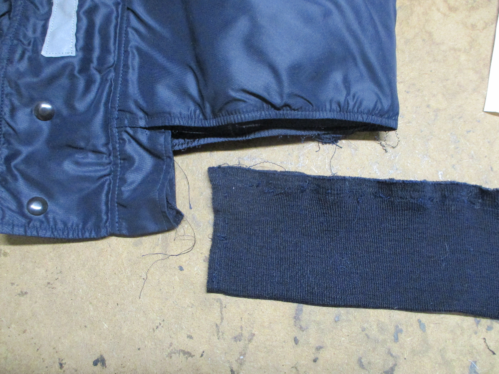 N-2Bフライトジャケットの腰回りのリブニットを新しいものに交換していきます。