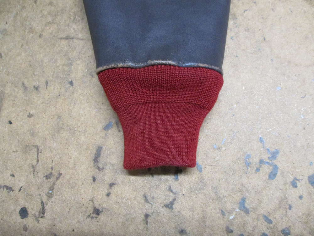 両袖と腰回りの破れだしたA-2フライトジャケットのリブニットを新しい赤リブに交換していきます。