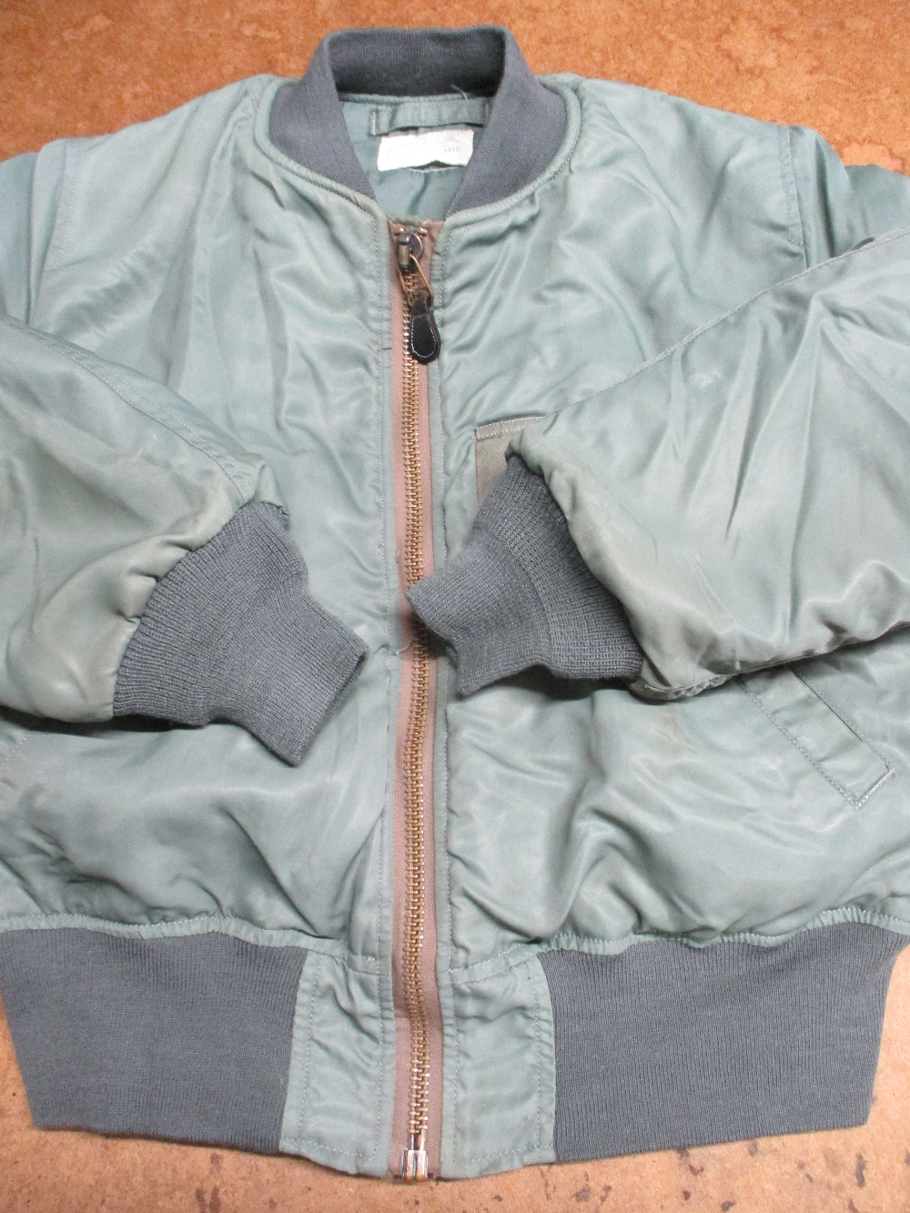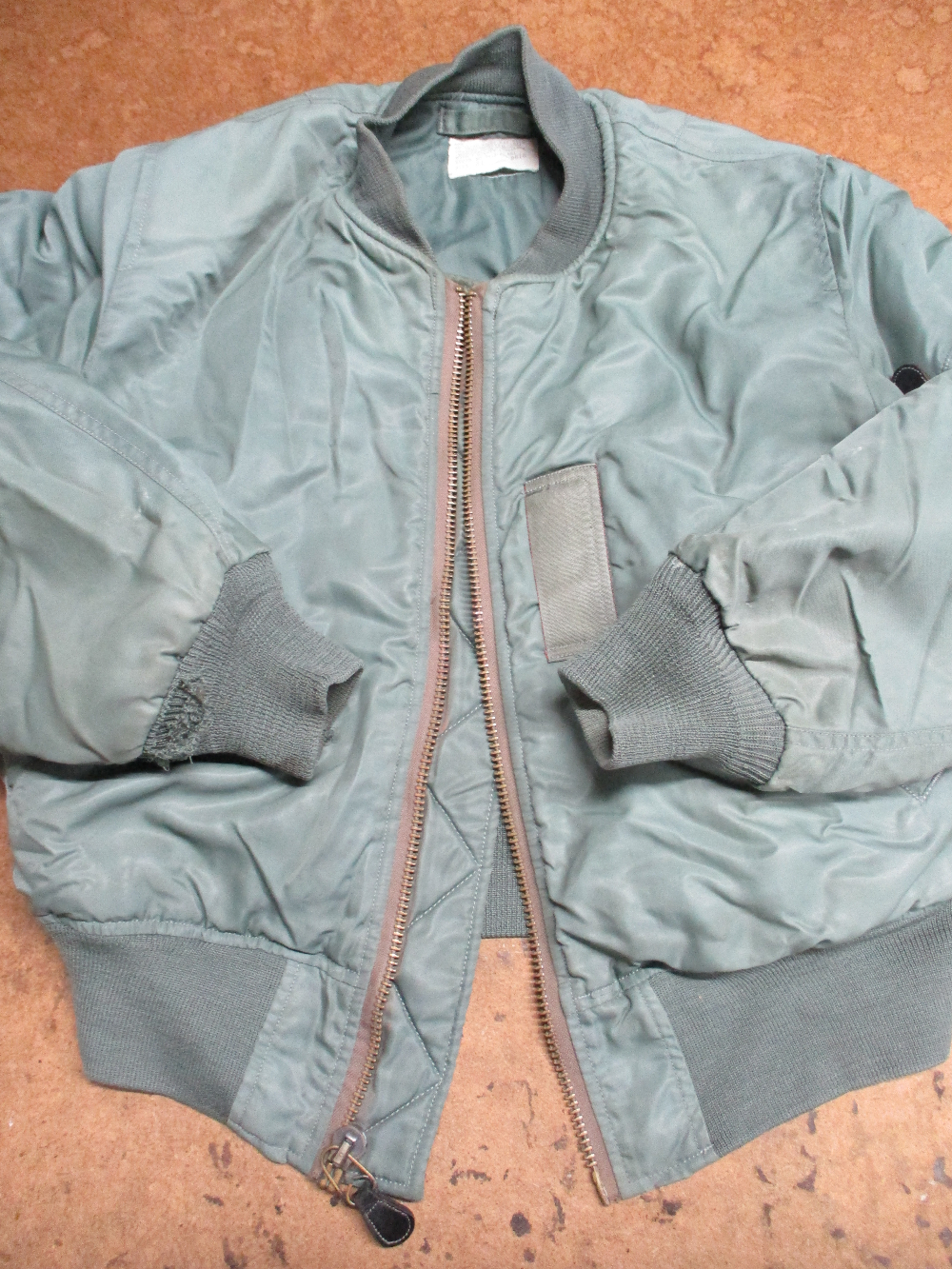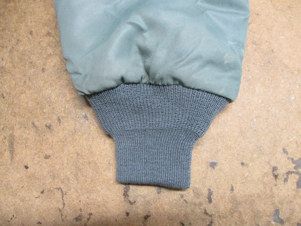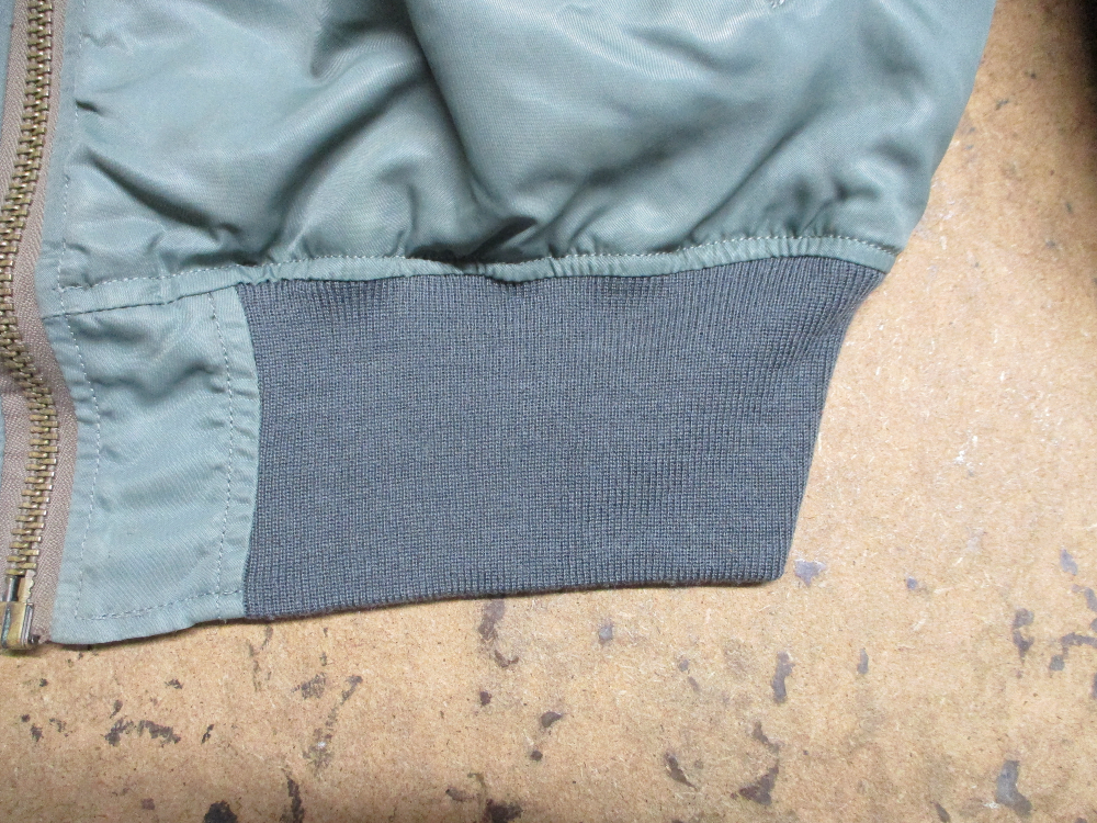 1枚目は神奈川県からの郵送のお客さんの襟、両袖、腰回りのリブニットを交換していく前のB-15フライトジャケットです。