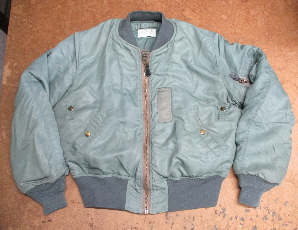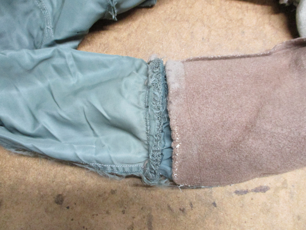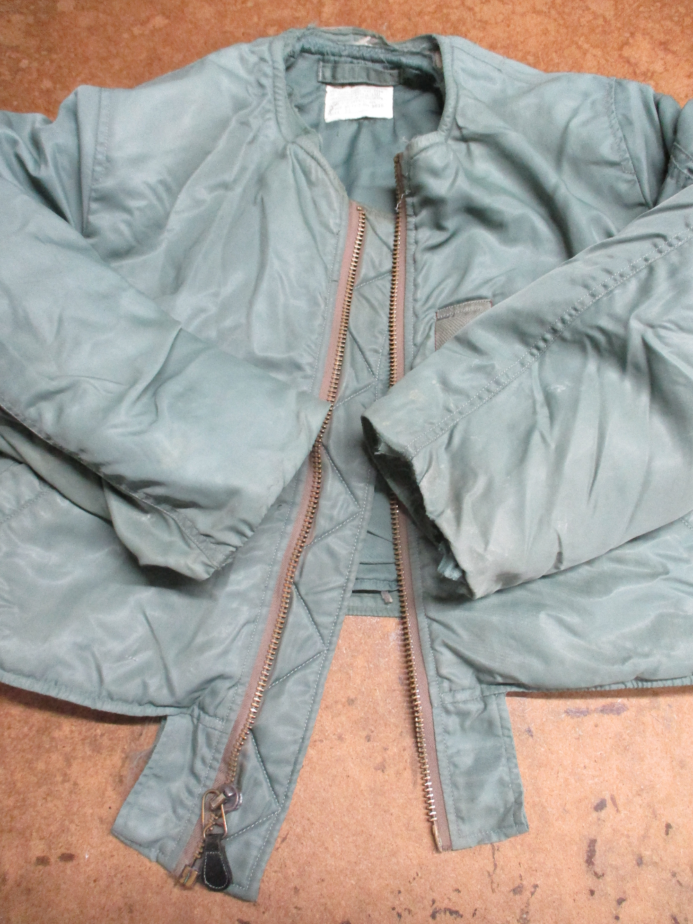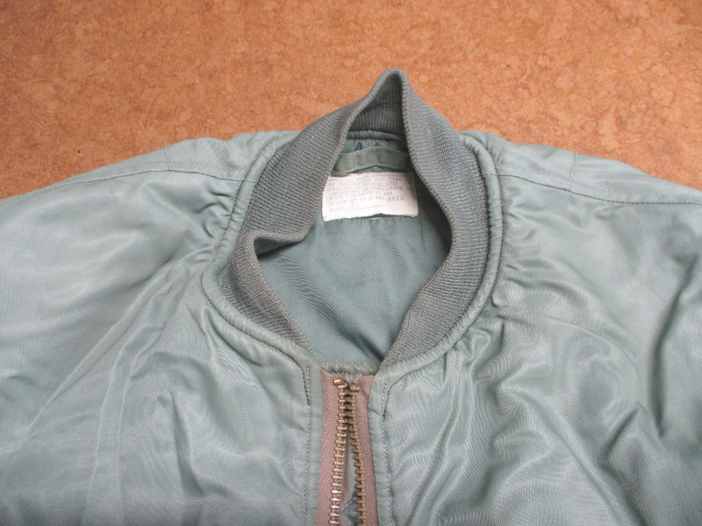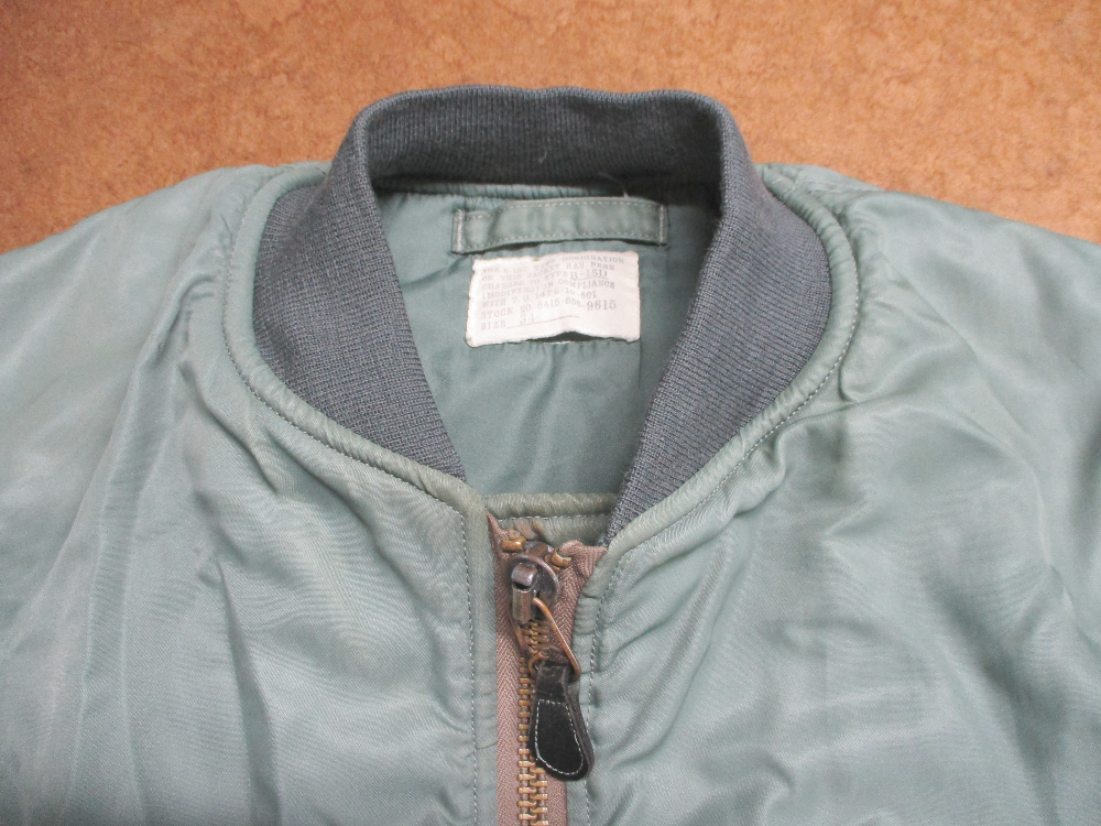 1枚目は神奈川県からの郵送のお客さんの襟、両袖、腰回りのリブニットを交換していく前のB-15フライトジャケットです。