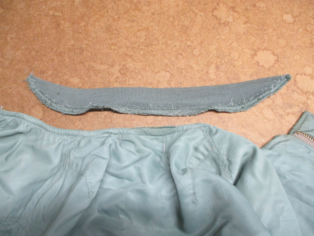 襟、両袖、腰回りの破れだしたB-15フライトジャケットのリブニットを新しいものに交換していきます。