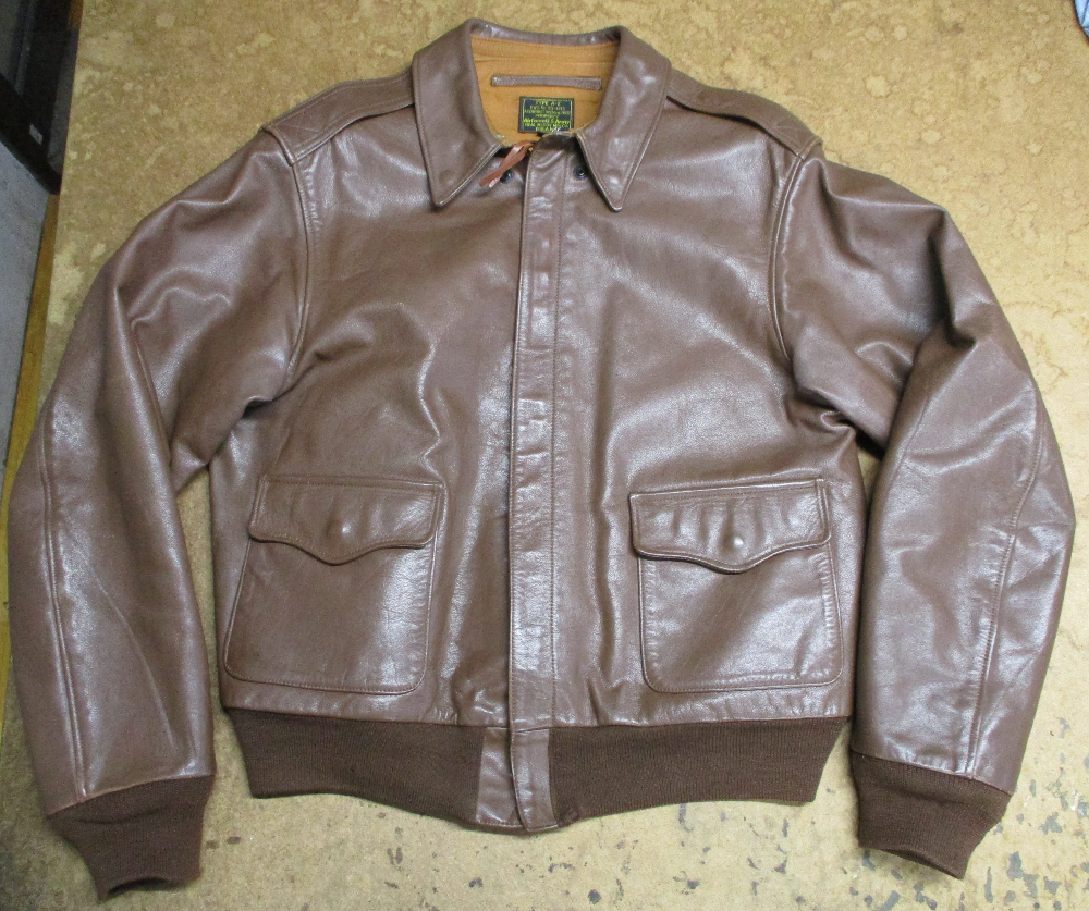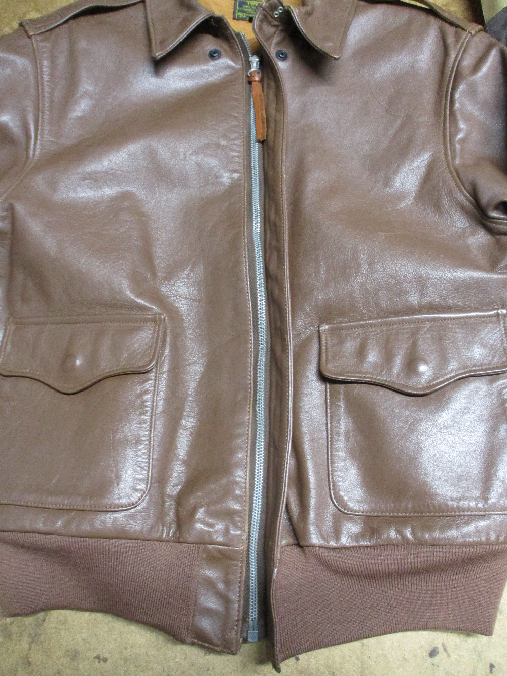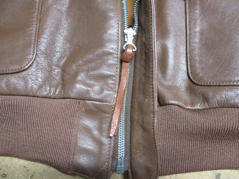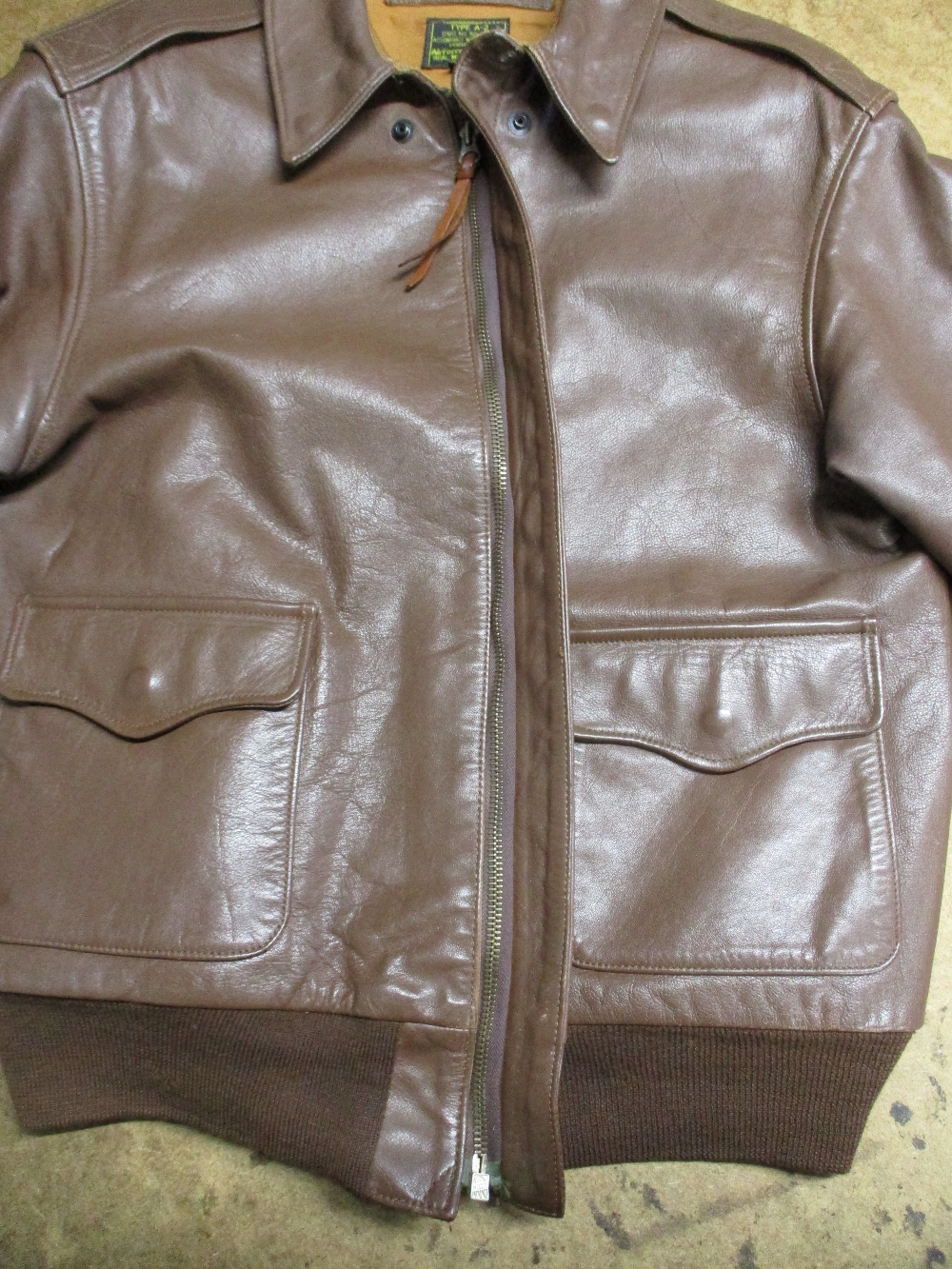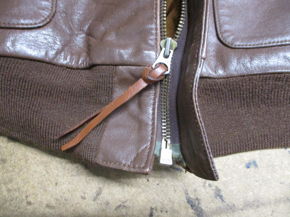 1枚目は神奈川県からの郵送のお客さんの両袖と腰回りのリブニットとフロントのファスナーを交換していくA-2フライトジャケットです。