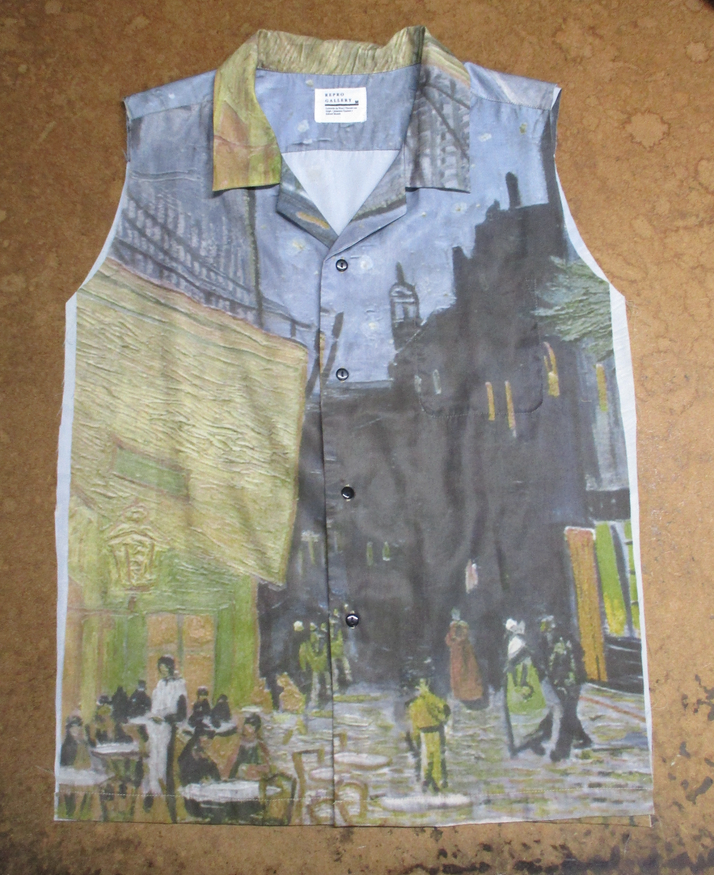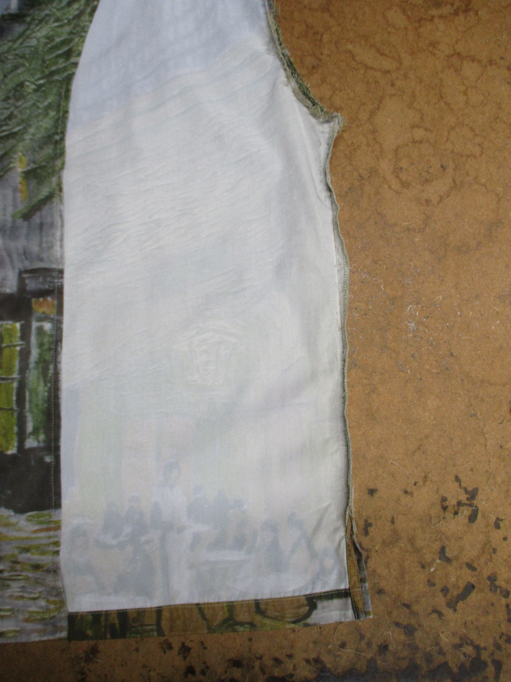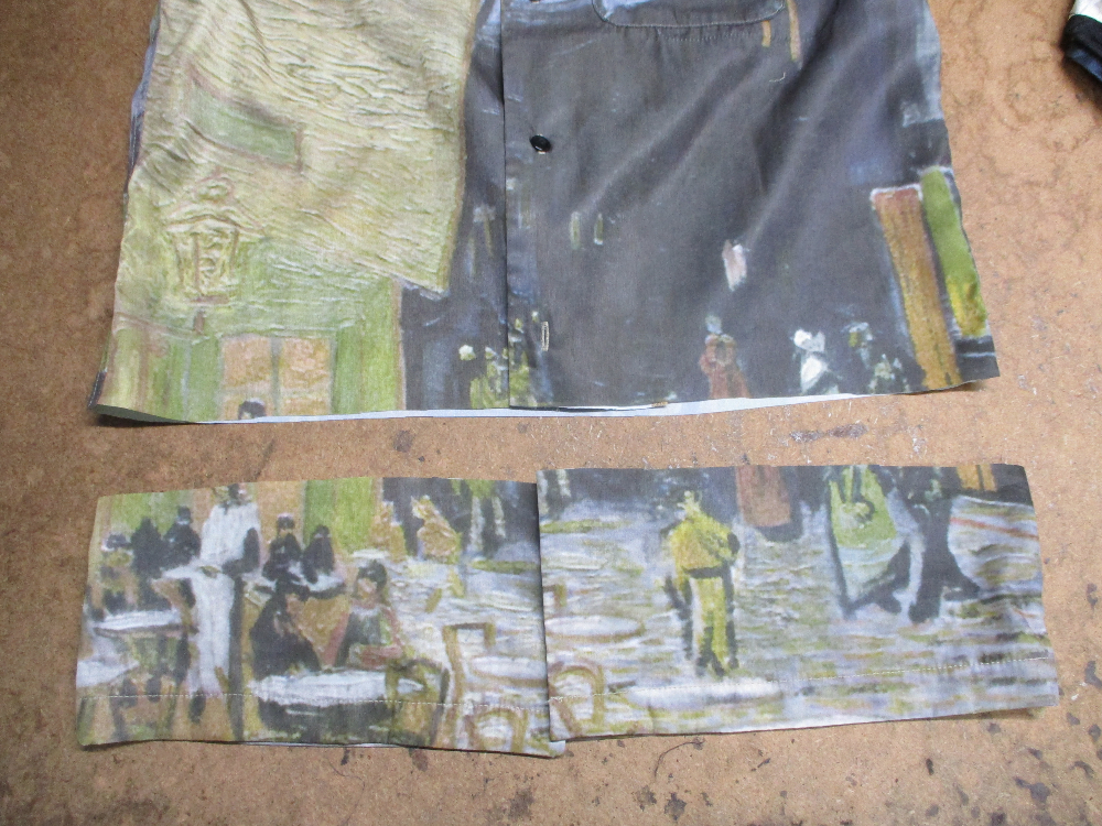 4枚目は脇から袖先のサイドの生地をカットして見本のアロハシャツの幅に合う様にしていきます。
