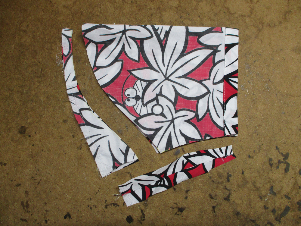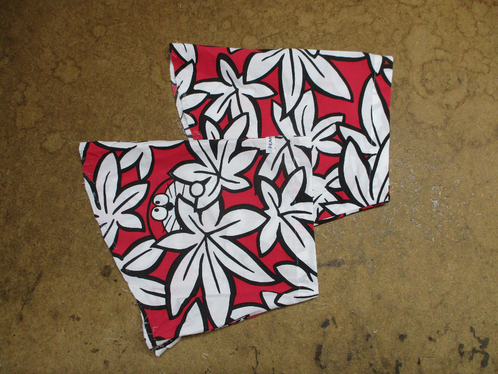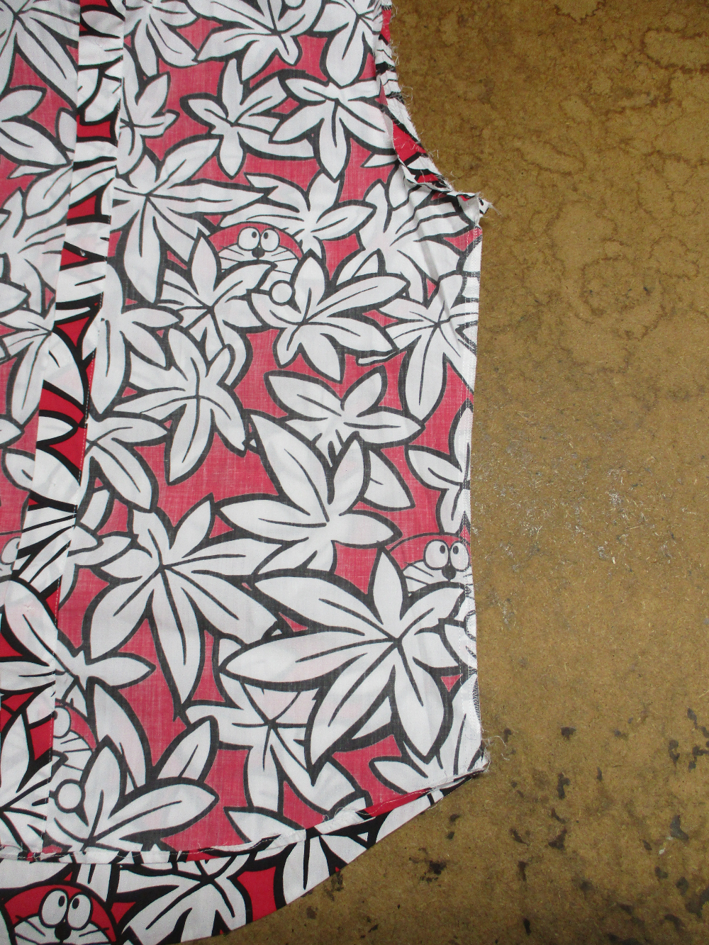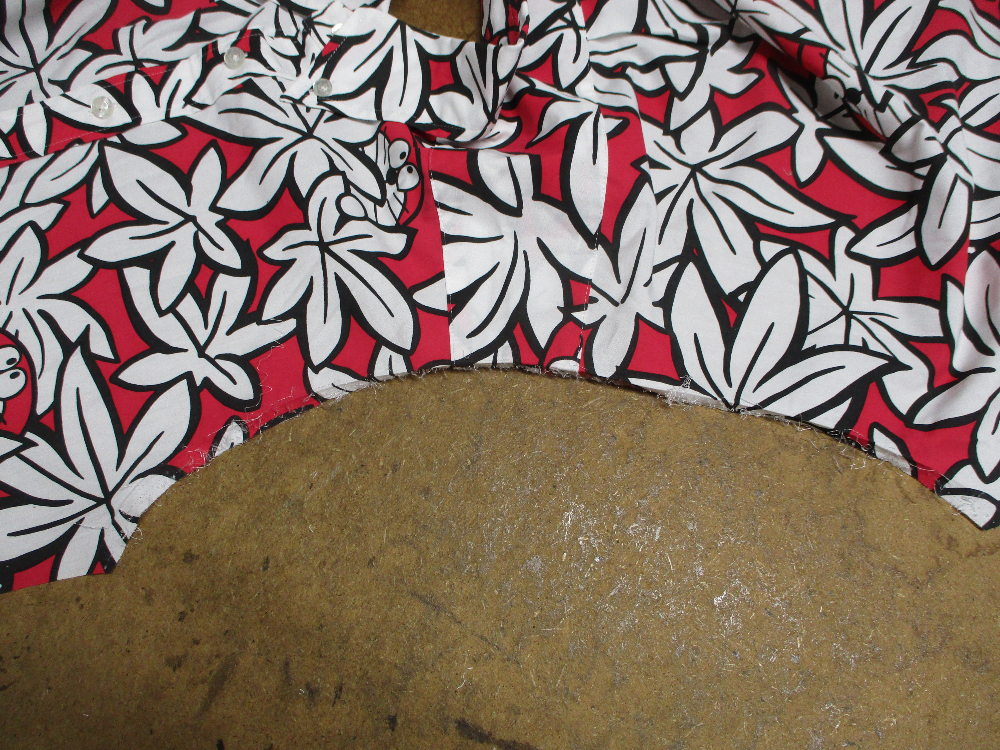 4枚目は脇から裾のサイドの生地をカットして見本のアロハシャツの幅に近づけていきます。