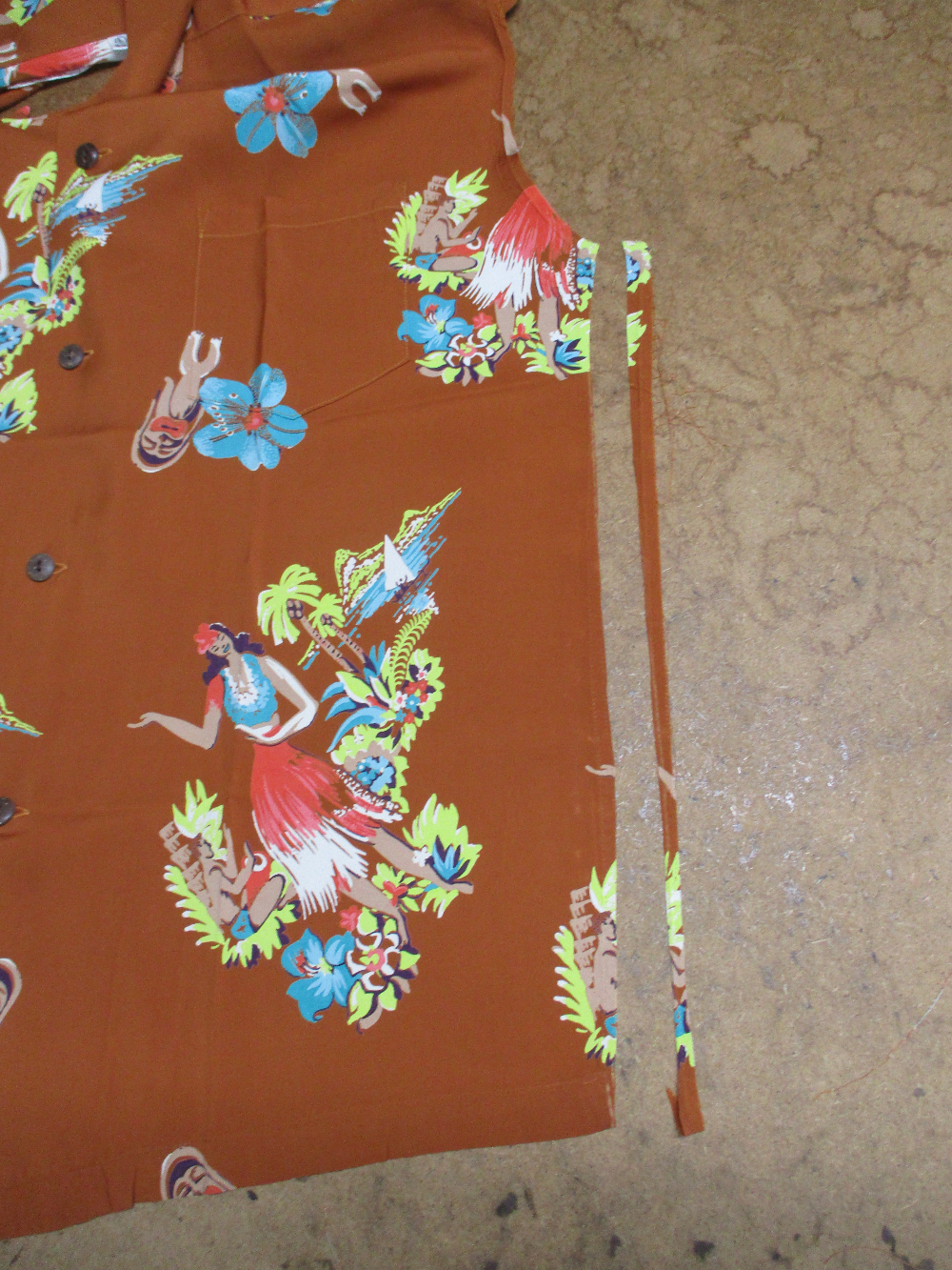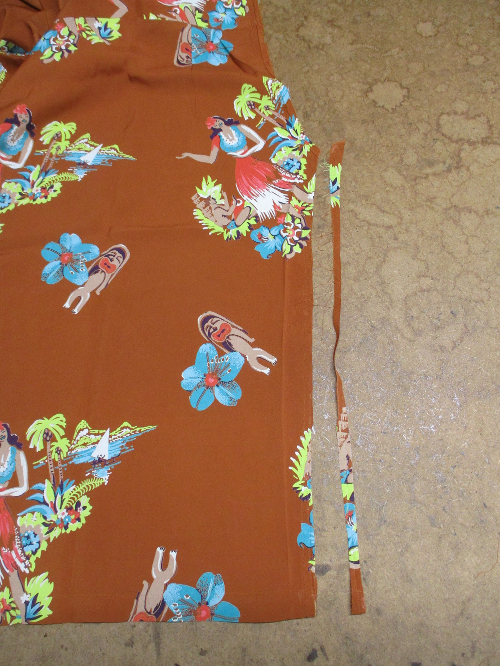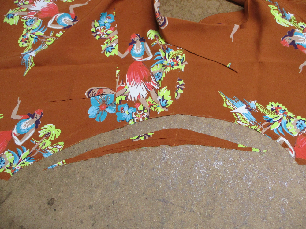 4枚目は前身ごろの脇から裾にかけてサイドの生地をカットして見本のアロハシャツの幅に近づけていきます。