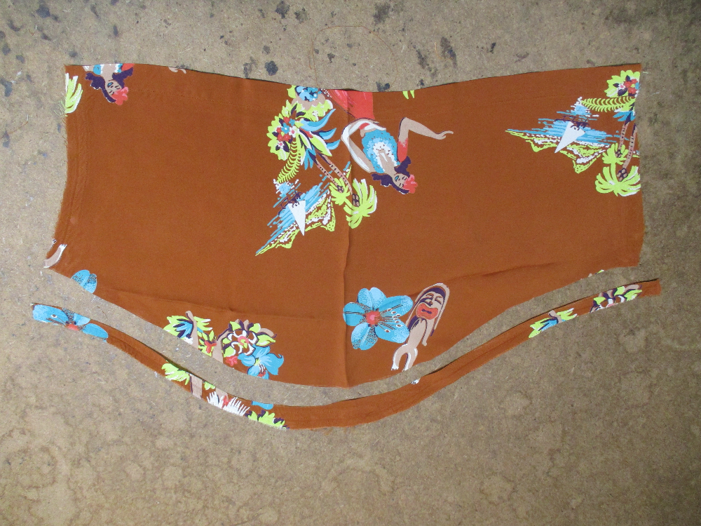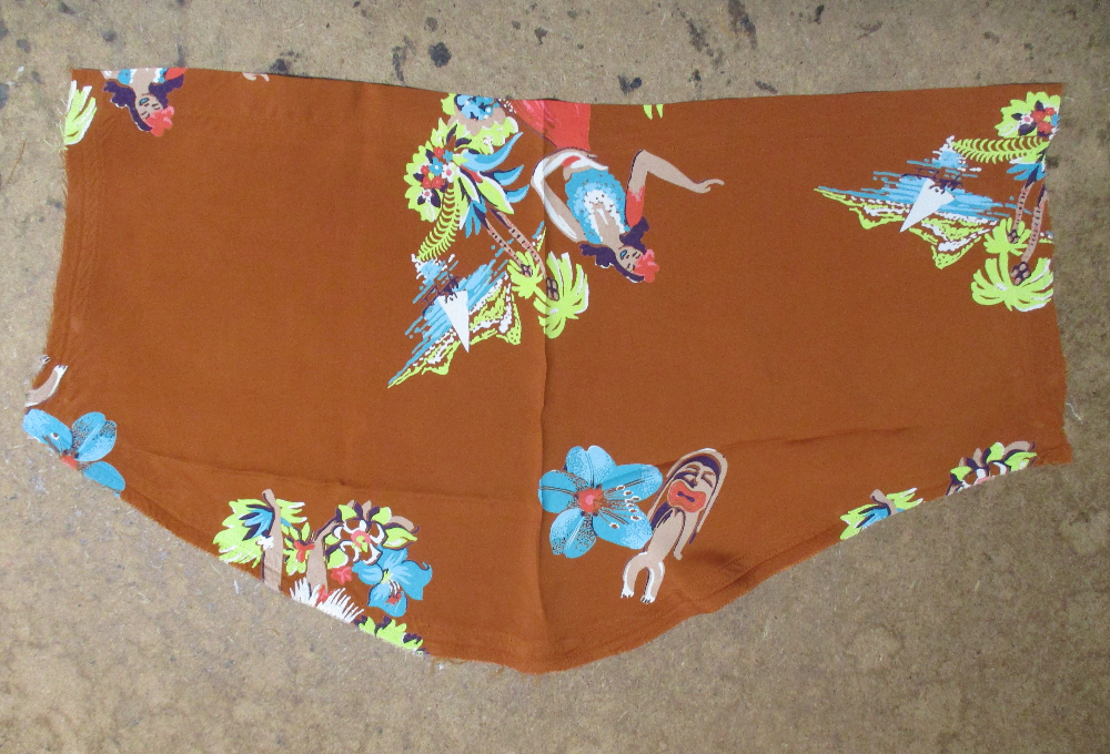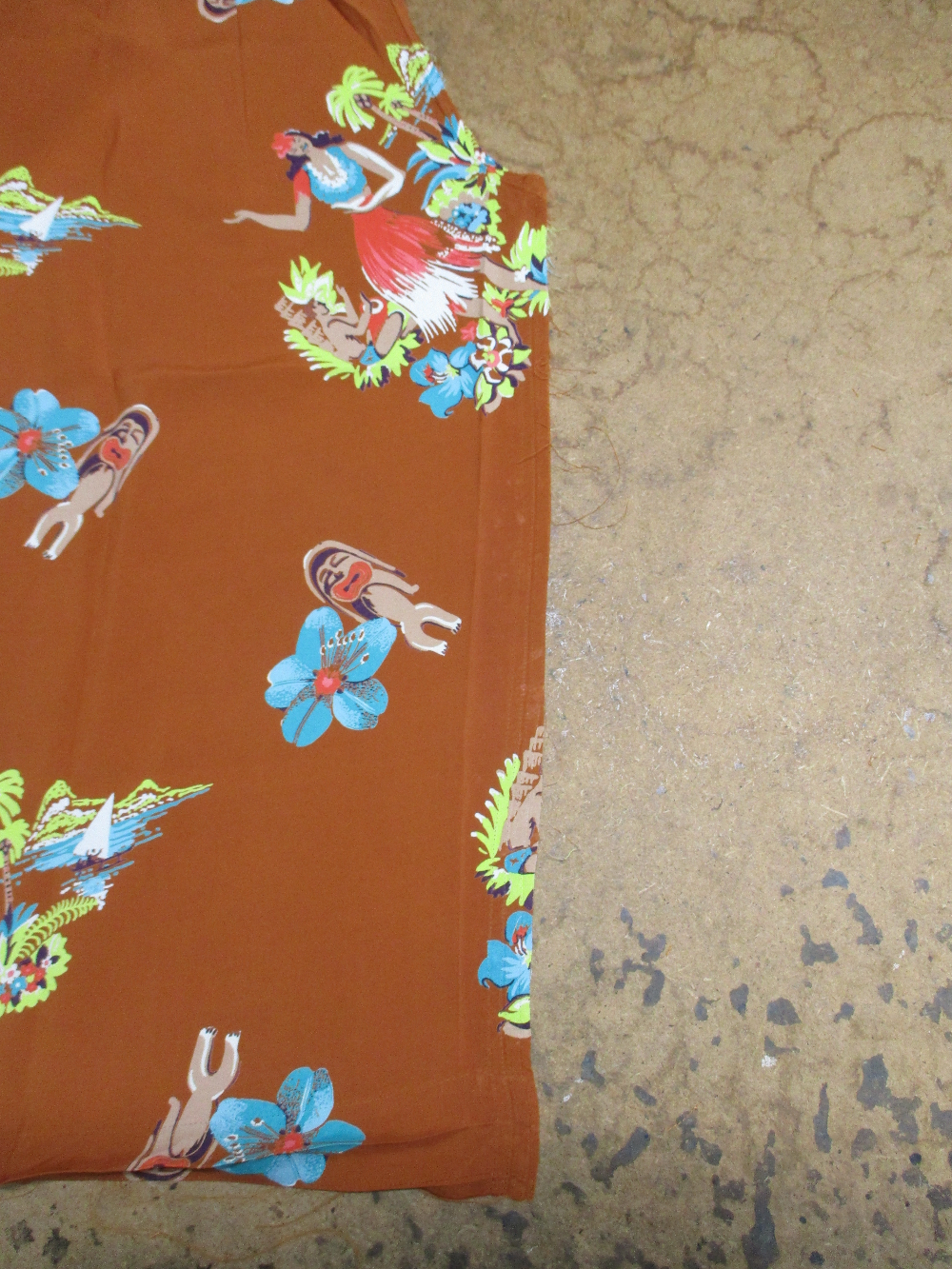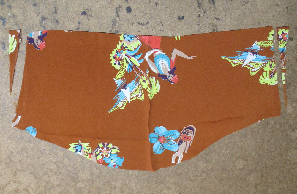 4枚目は前身ごろの脇から裾にかけてサイドの生地をカットして見本のアロハシャツの幅に近づけていきます。