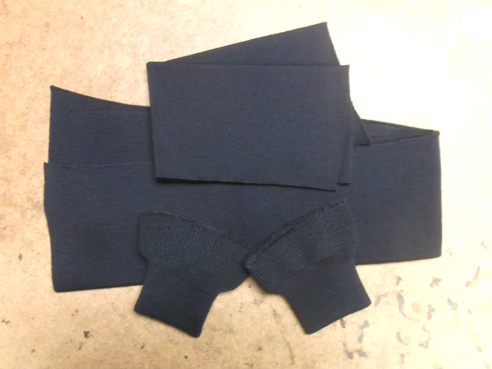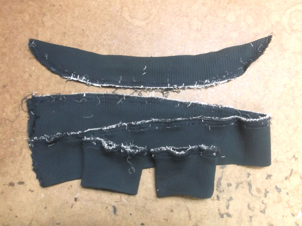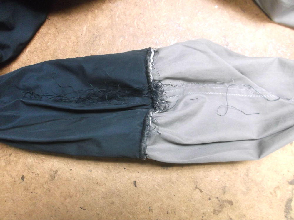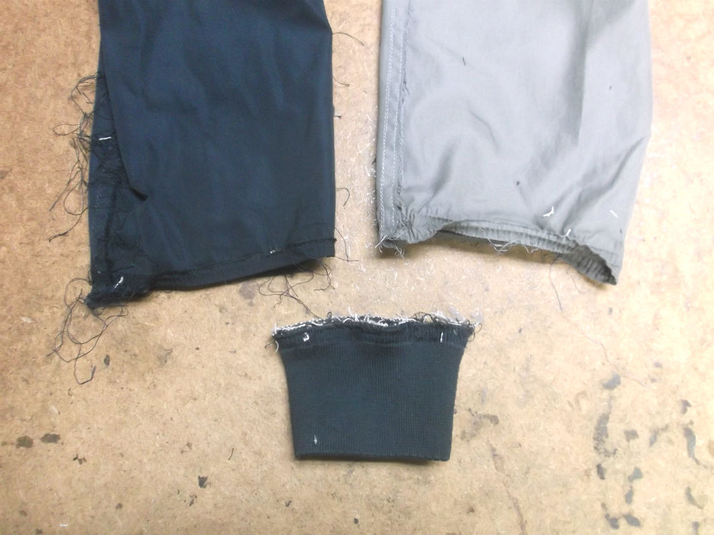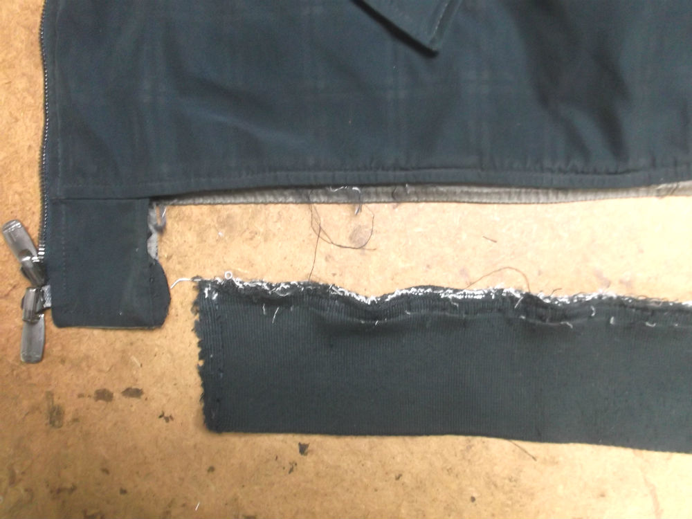 汚れて縮みだした襟と袖と腰回りのリブニットの付いたジャケットをお客さんの用意したリブニットに交換していきます。