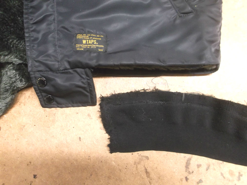 所々破れだしたMA-1フライトジャケットのリブニットを新しいものに交換…
