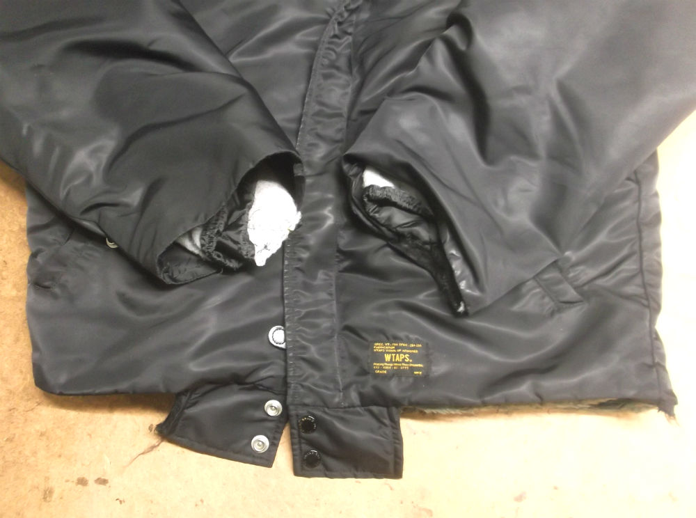 両袖と腰回りのリブニットが破れだしたジャケットを新しいものに交換していきます。