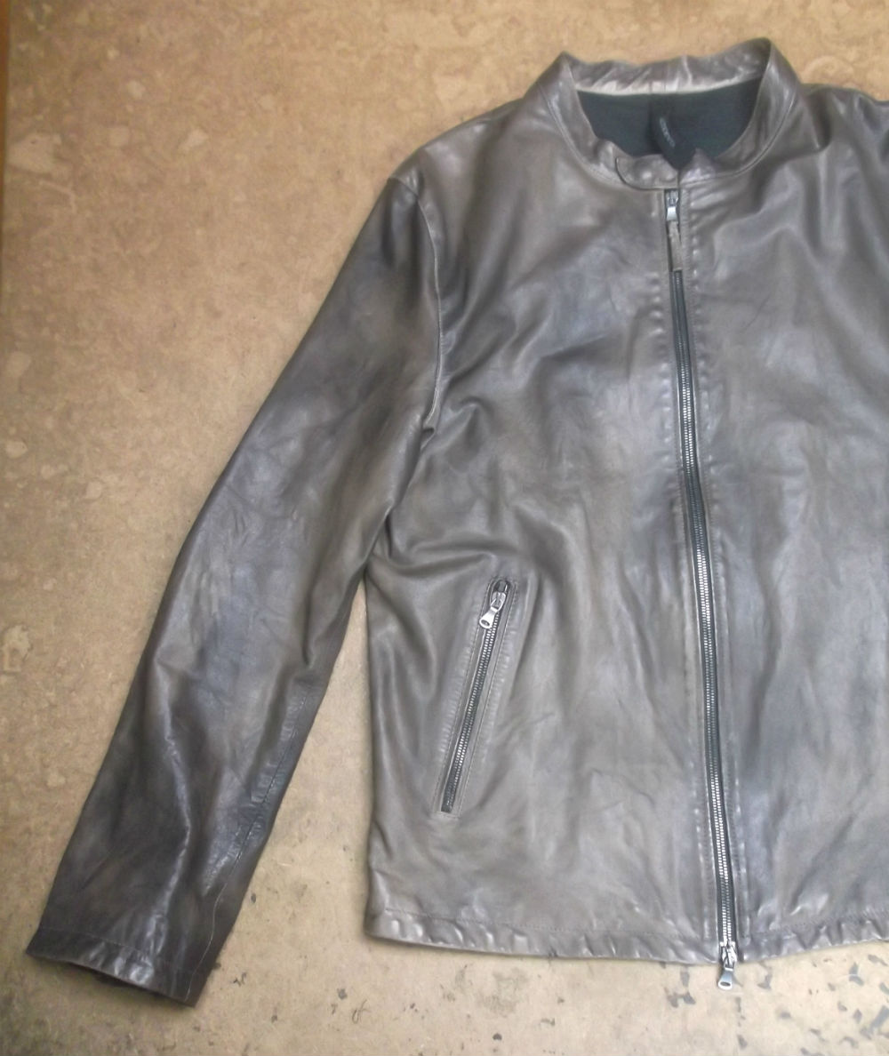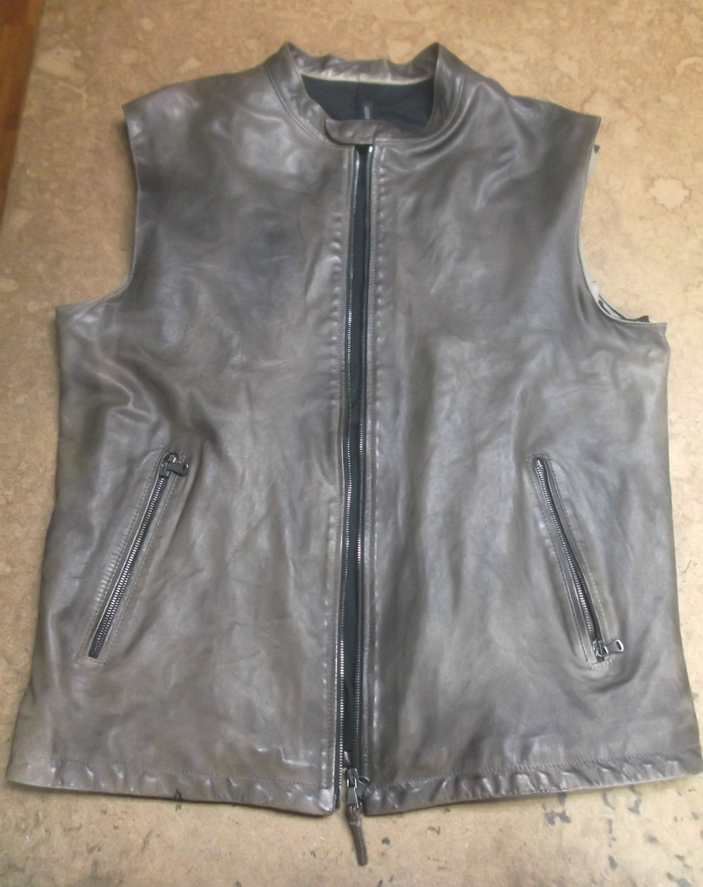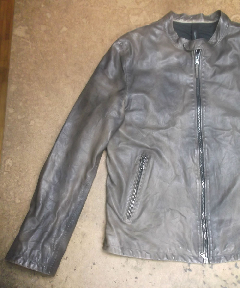 9枚目は10枚目との比較で袖丈を肩口から短くしていく前のレザージャケットの写真です。
