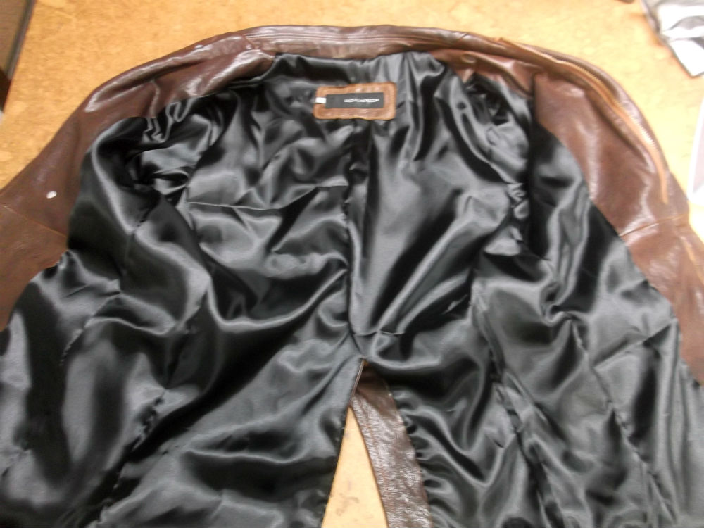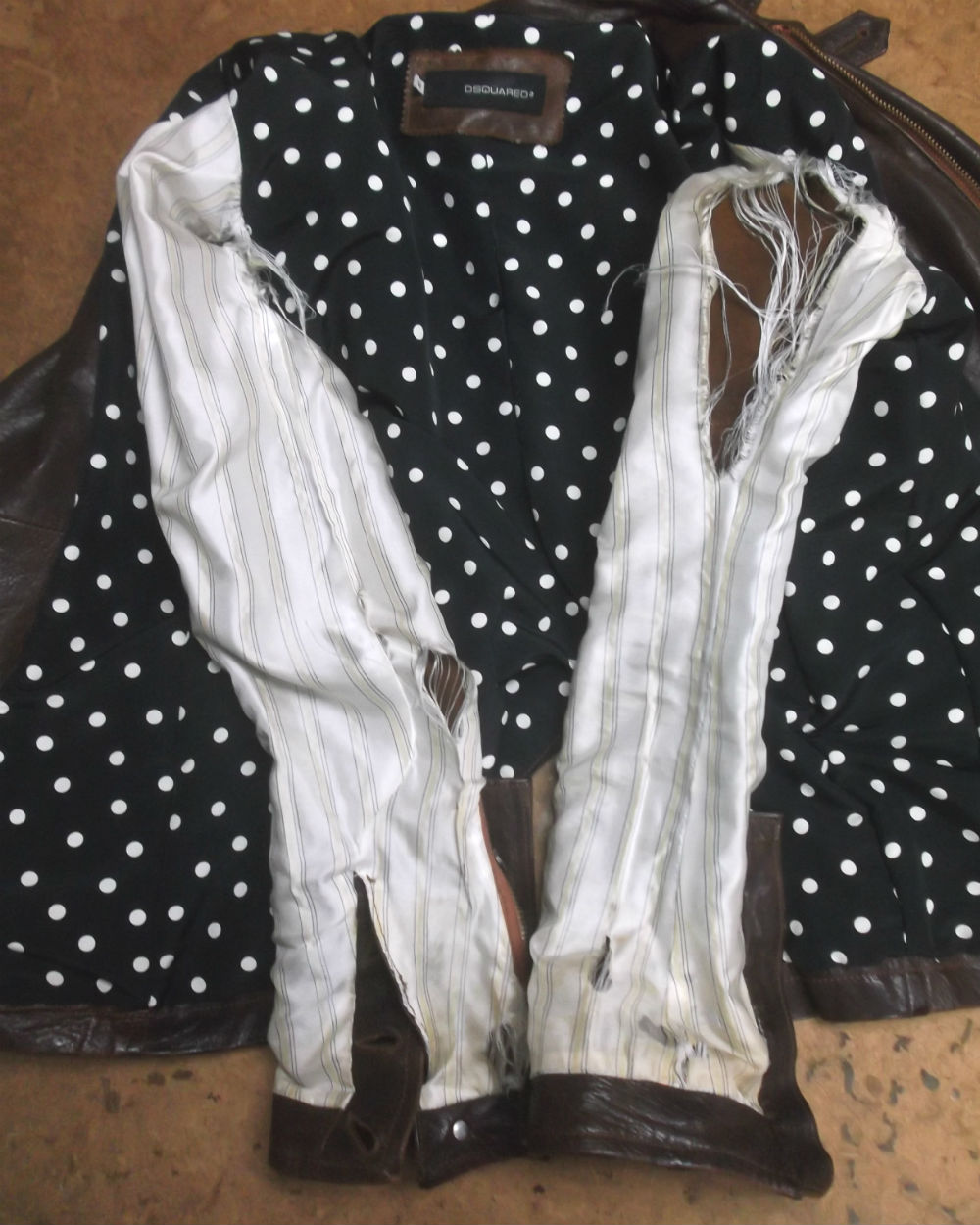 6枚目はレザージャケットから破れた裏地の生地を取り外した後の写真です。