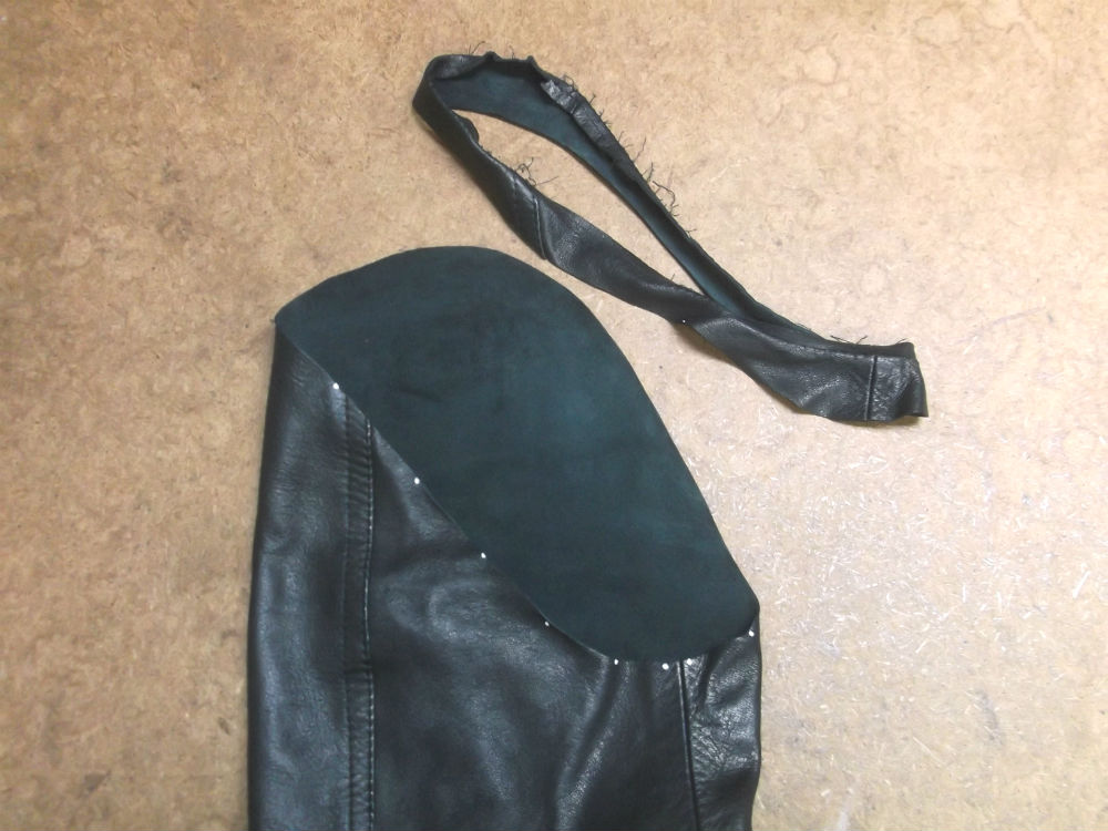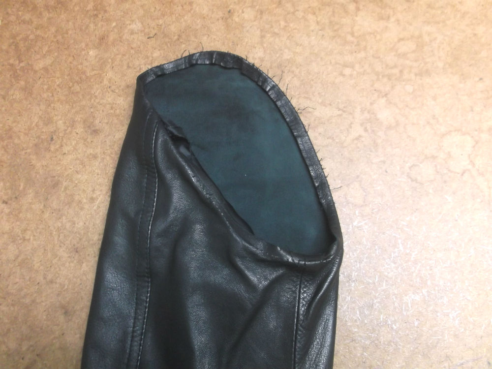 4枚目は袖山から表のレザー部分をカットしてお客さんの好みの長さの袖丈に短くしていきます。
