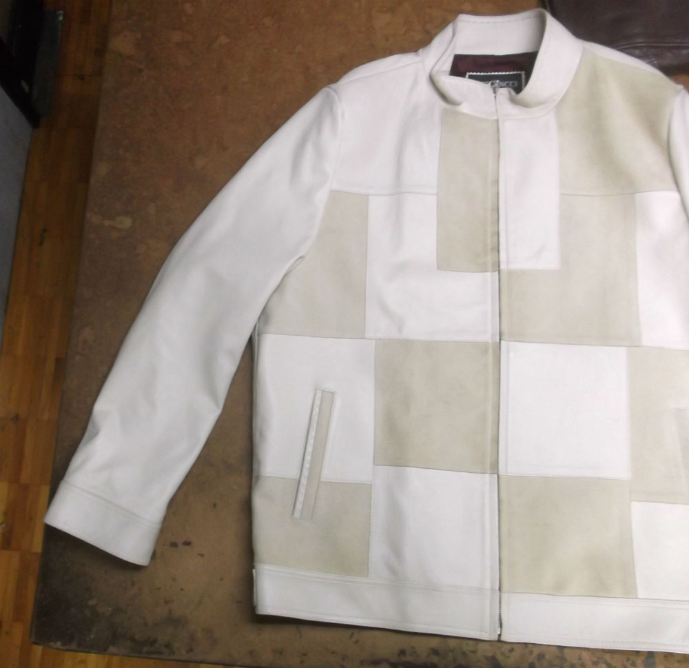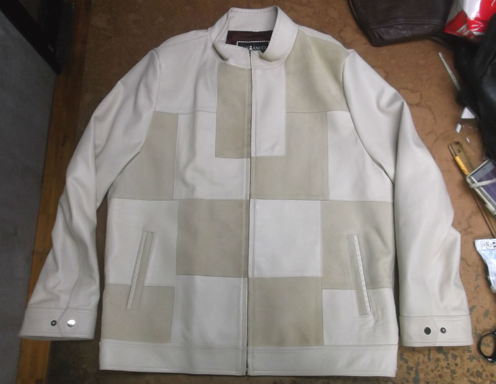 大きいサイズのレザージャケットをお客さんの好みの大きさに小さくリサイズしていきます。