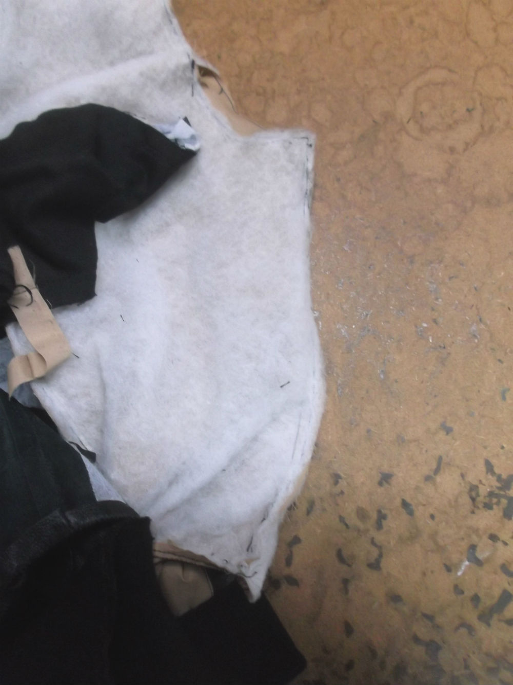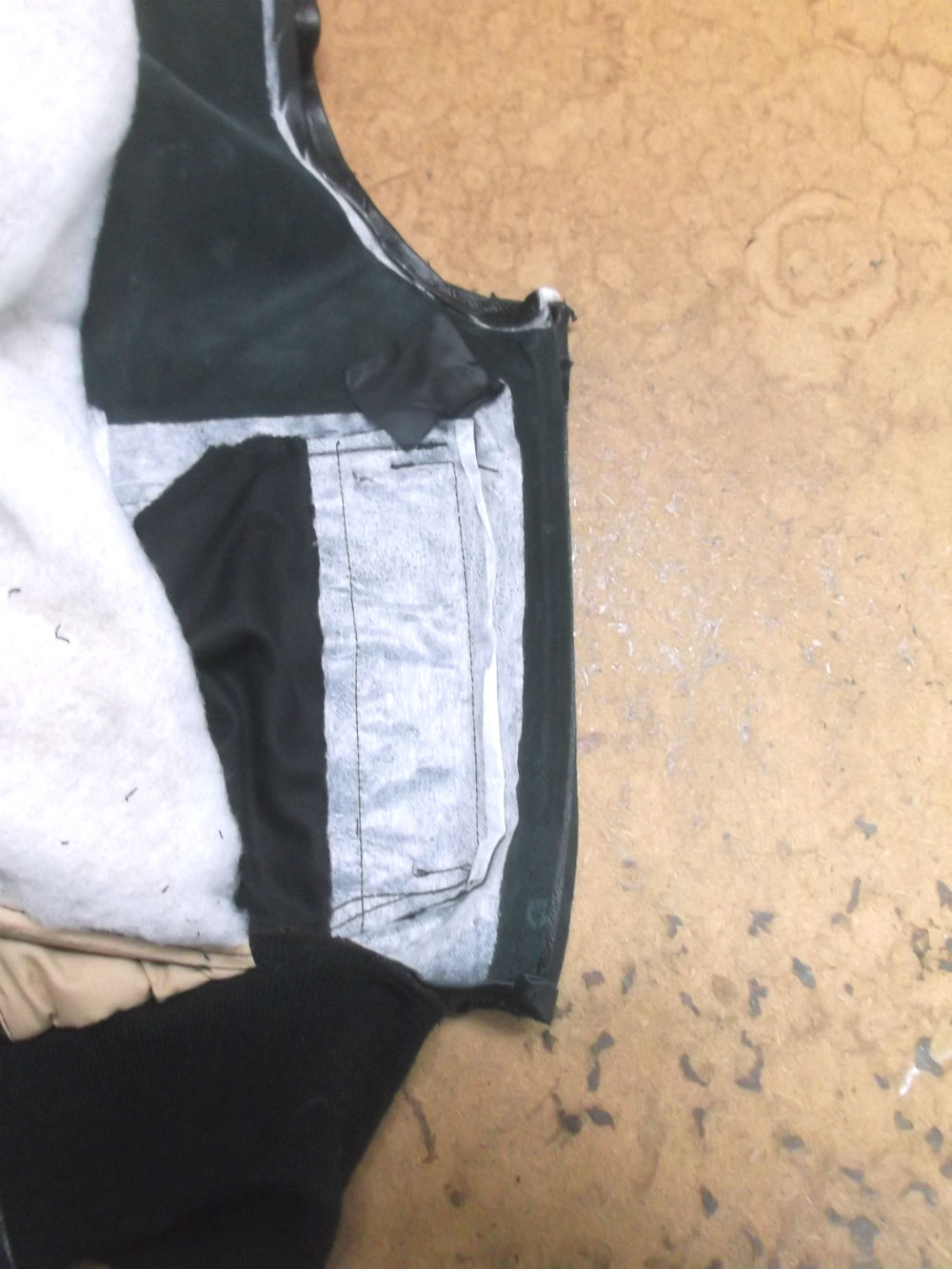 21枚目は裏地の脇から袖先にかけて生地をカットした後の写真です。