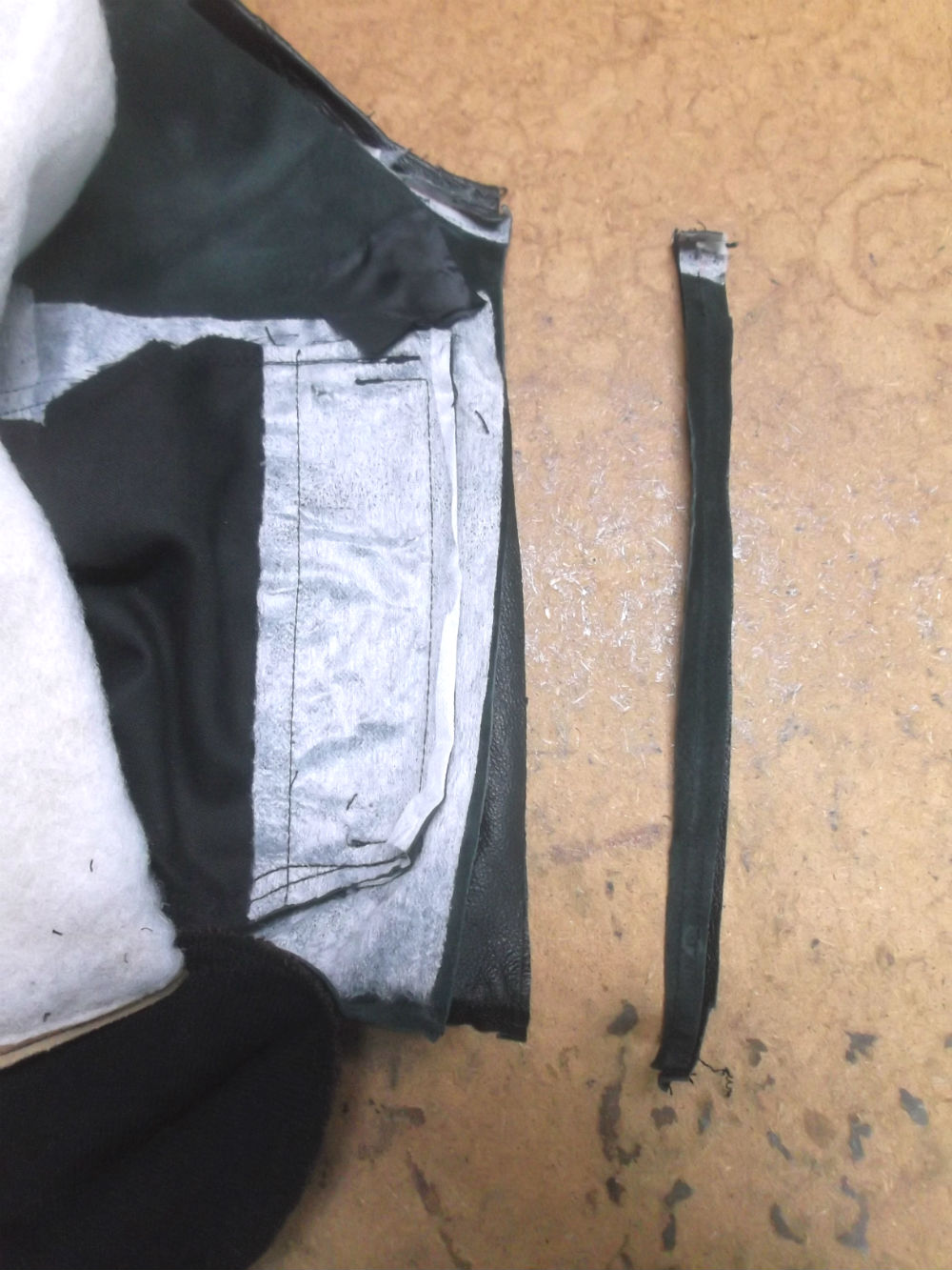 20枚目は裏地の脇から袖先にかけて表のレザー部分と同じ幅の生地をカットしていきます。