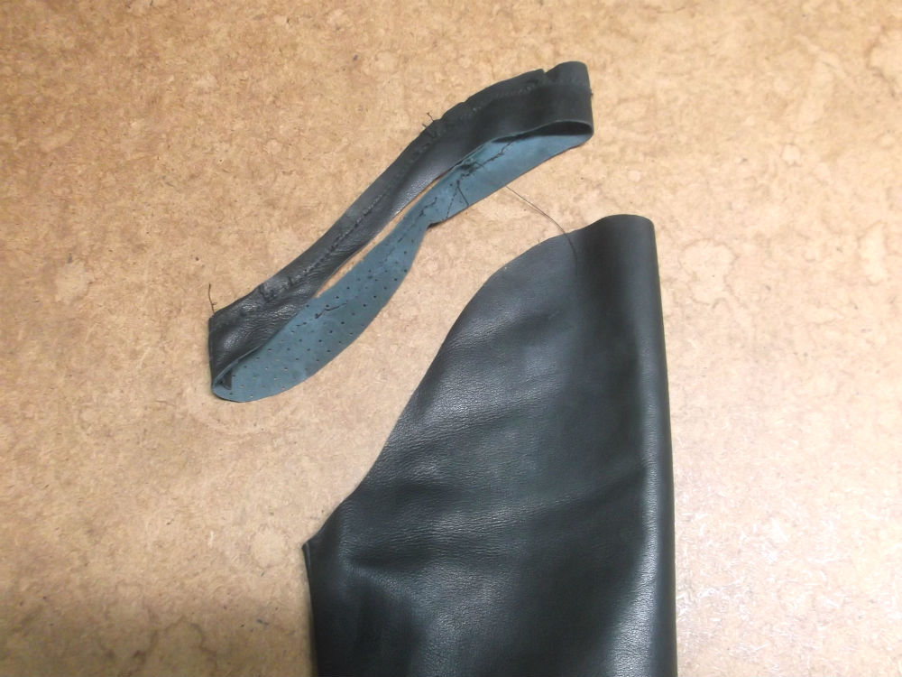6枚目は裏地の袖山の生地も表のレザー部分と同じ長さを短くしていきます。