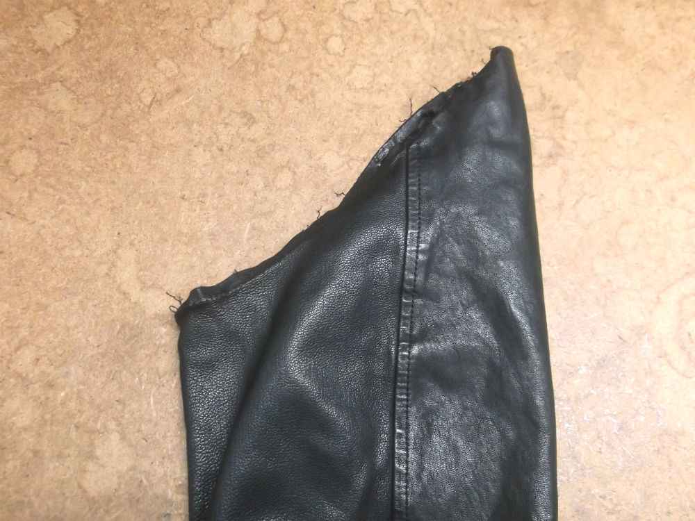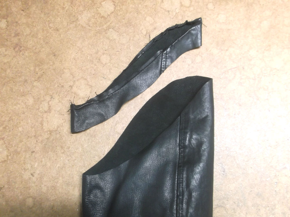 4枚目は表のレザー部分をカットして袖丈を短くしていきます。