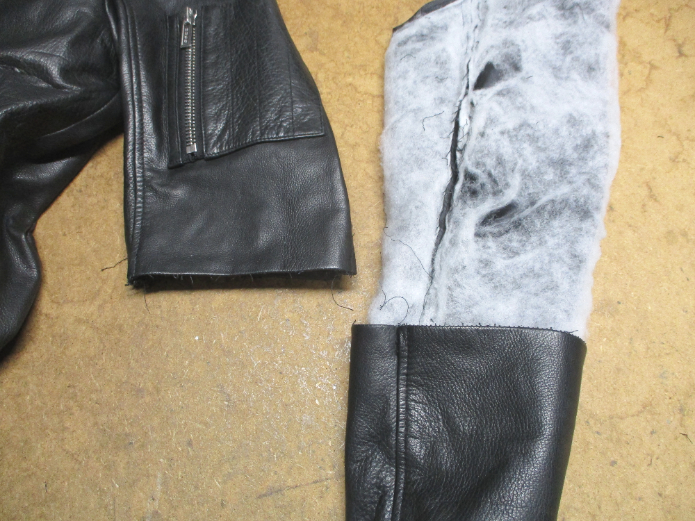 6枚目は肘付近の袖先の方のレザーもカットして袖丈を短くしていきます。