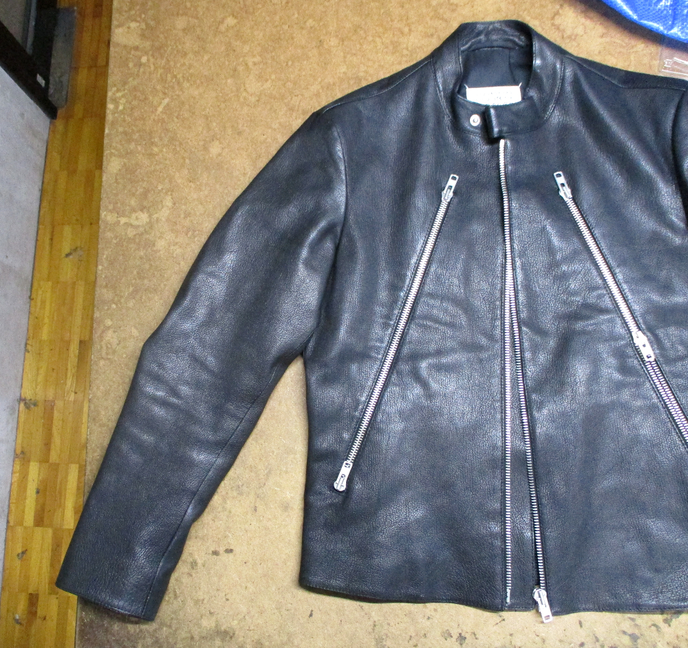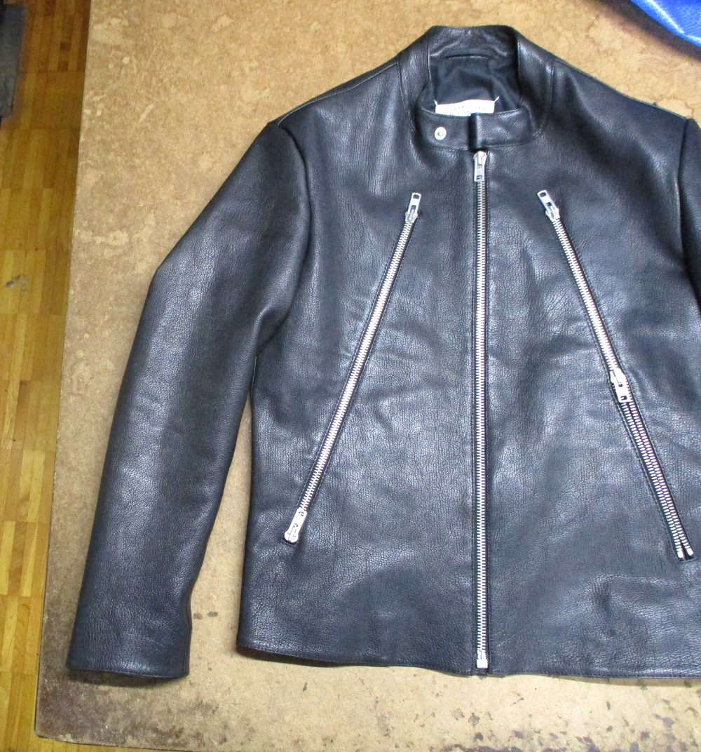 長い袖丈のマルジェラのレザージャケットをお客さんの好みの長さに短くリサイズしていきます。