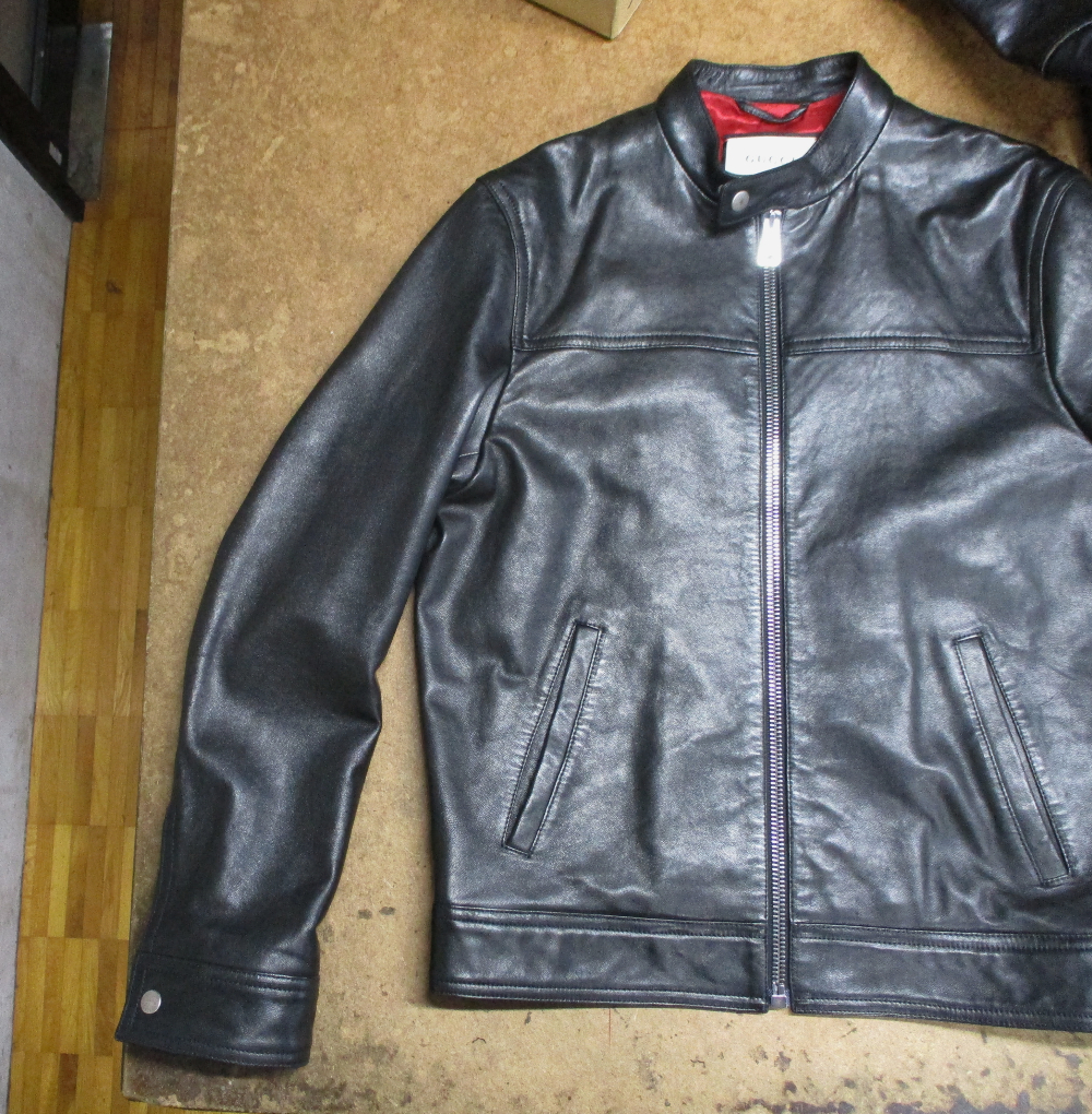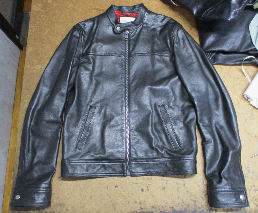 グッチの長い袖丈のレザージャケットをお客さんの好みの長さに短くリサイズしていきます。