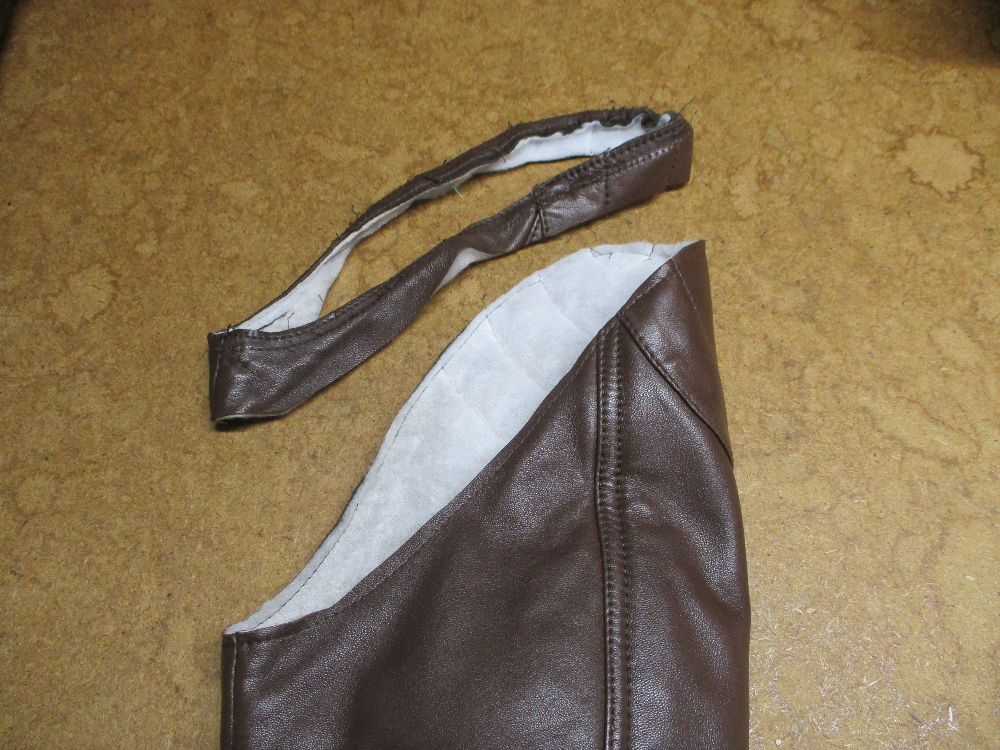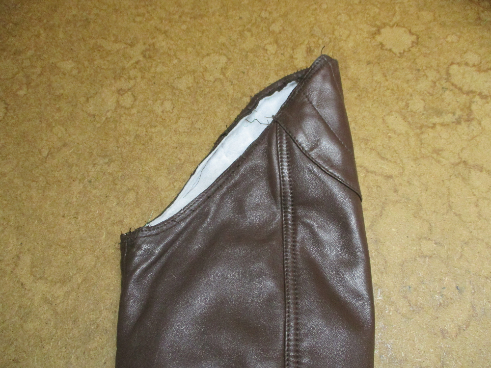 6枚目は裏地の袖山の生地も表のレザー部分と同じ長さを短くカットしていきます。
