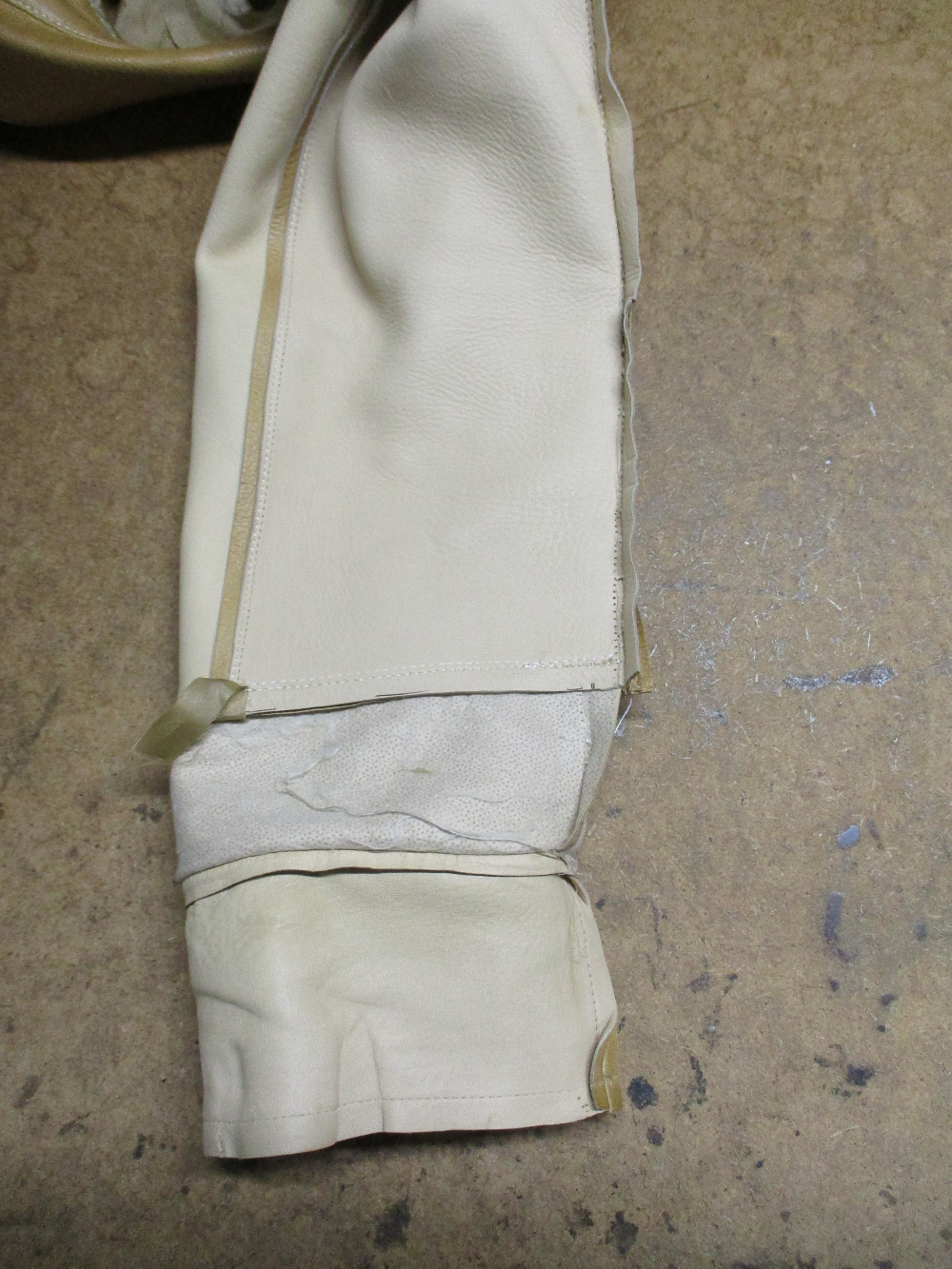 袖先パーツ上のレザーをカットしたので幅が広がってますので元の幅に細く直してサイドを取り付けていきます。