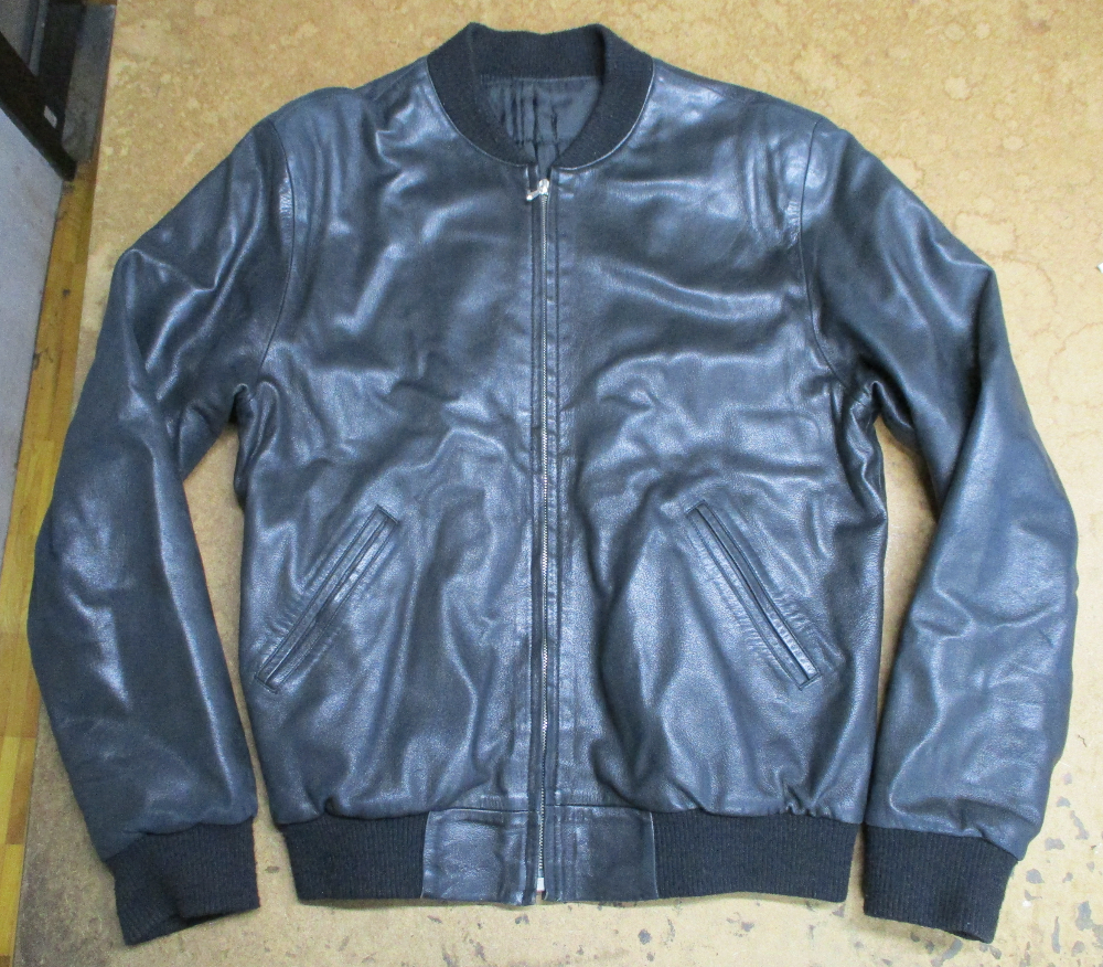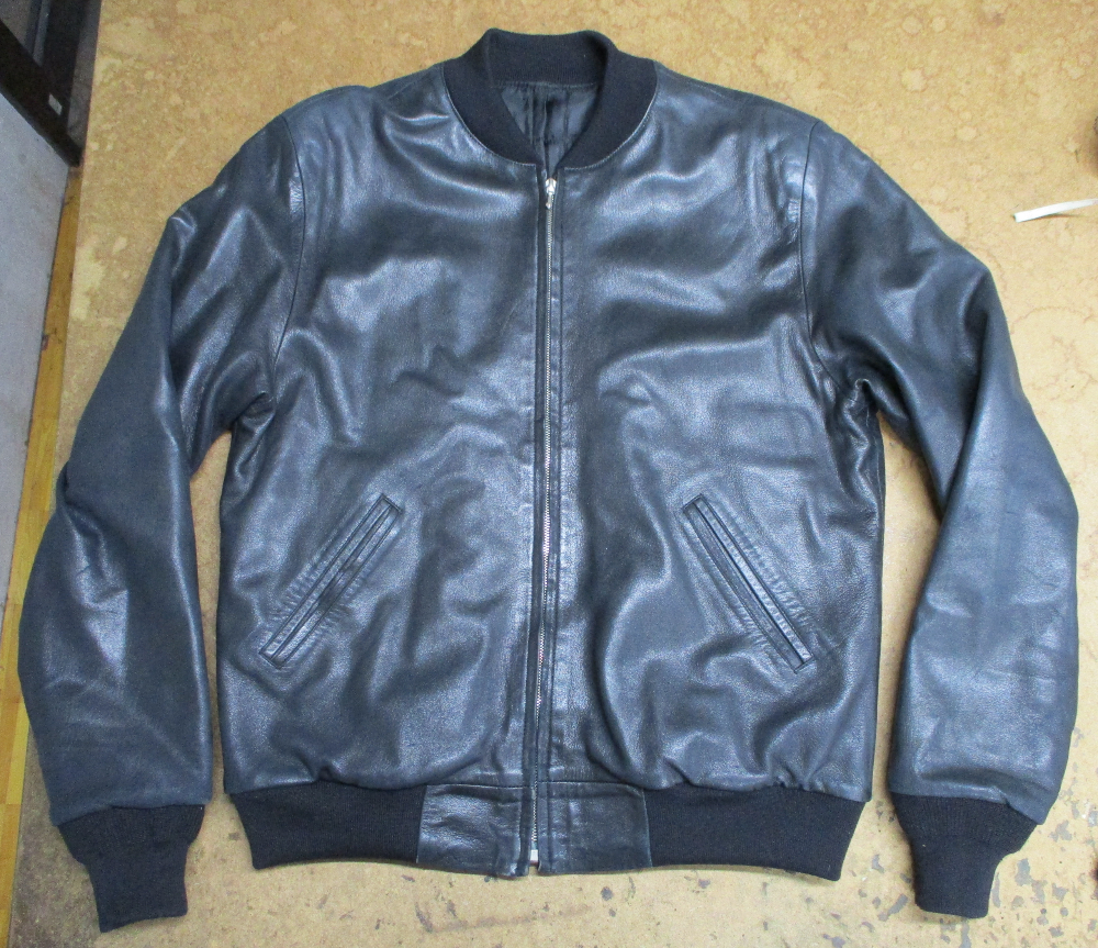 16枚目はレザージャケットに襟、両袖、腰回りのリブニットを取り付けた写真です。
