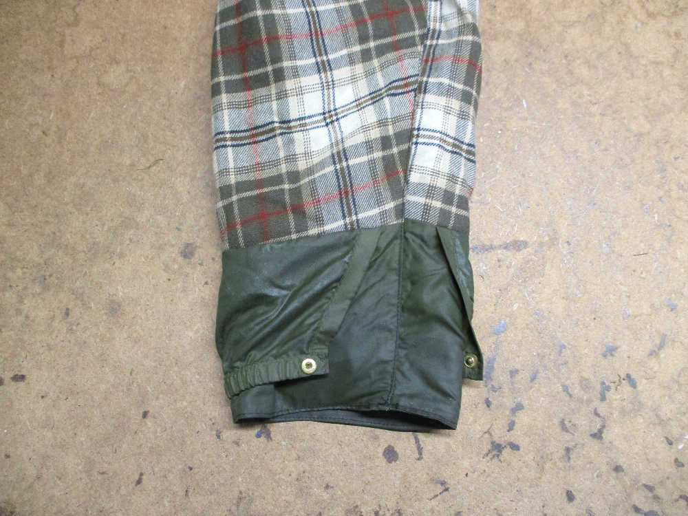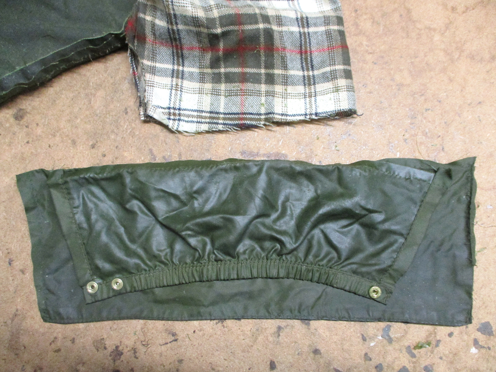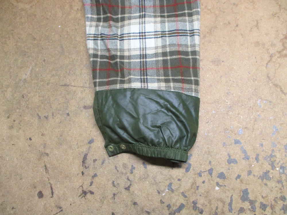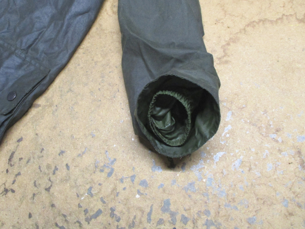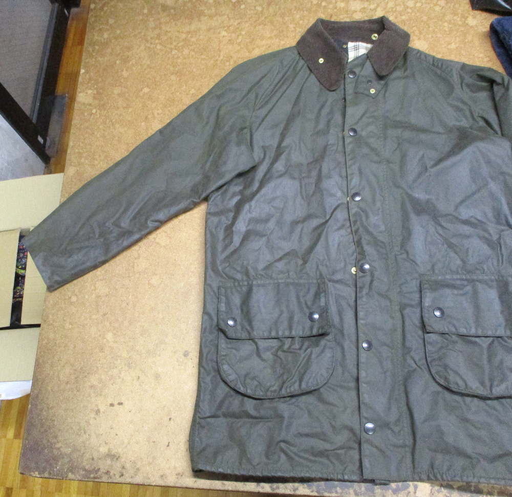 1枚目は来店されたお客さんの長い袖丈を短くしていく前のバブアーのオイルドジャケットです。