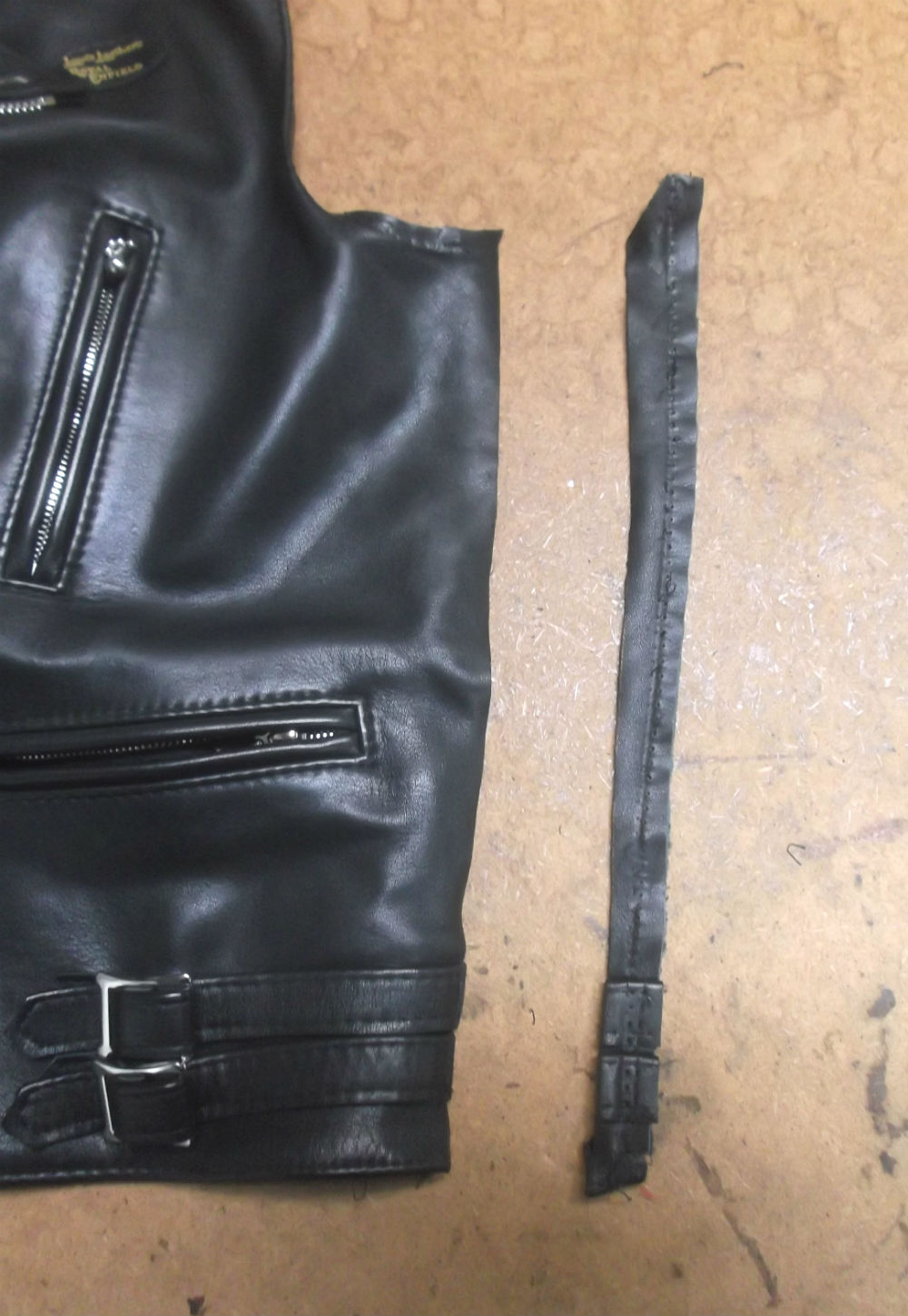大きいサイズのルイスレザーのジャケットをお客さんの好みのサイズに小さくしていきます。