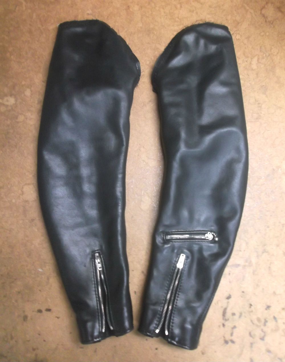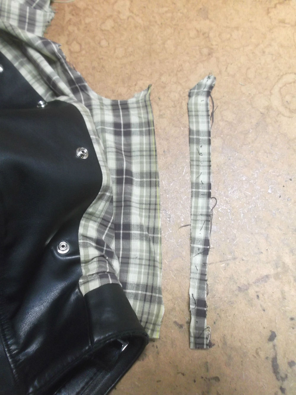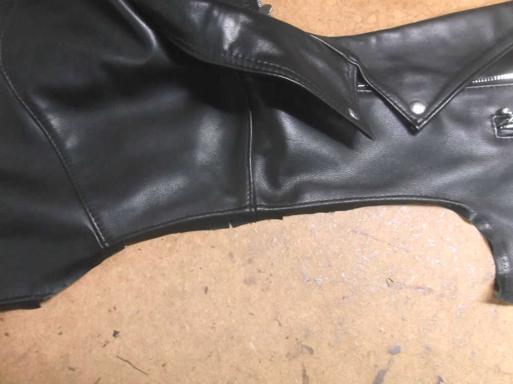 15枚目は袖山からレザーをカットして袖丈を短くしていきます。