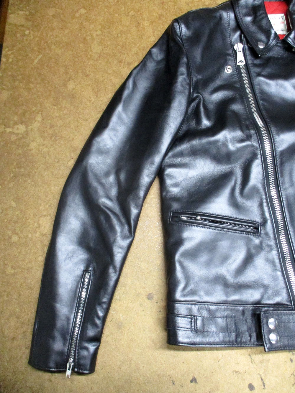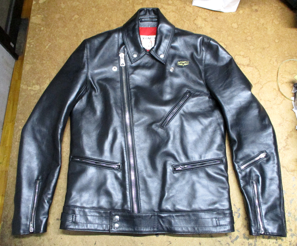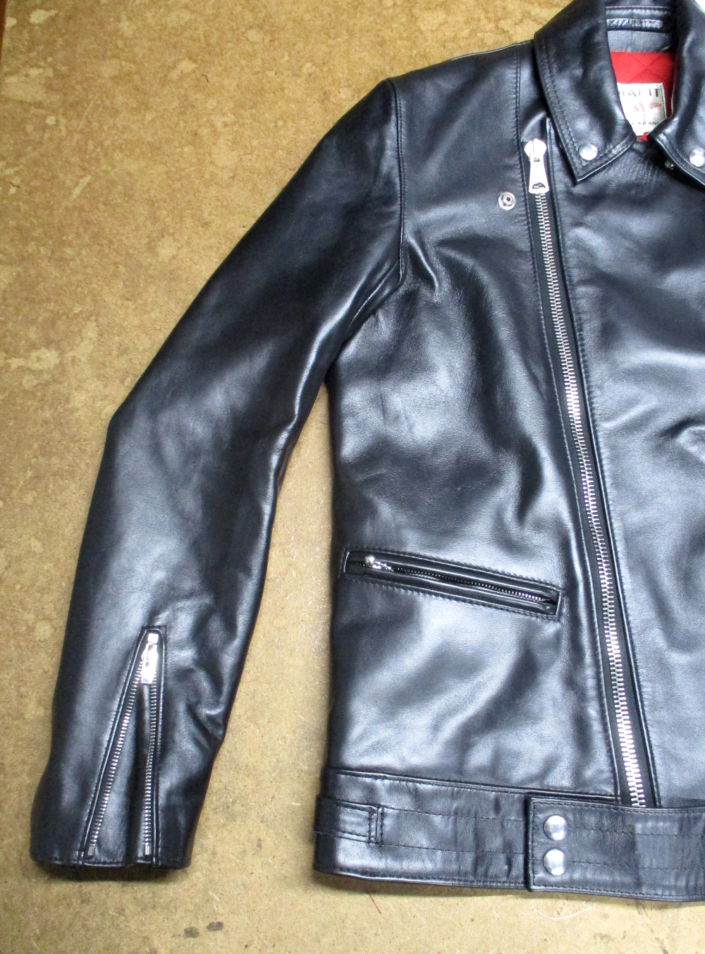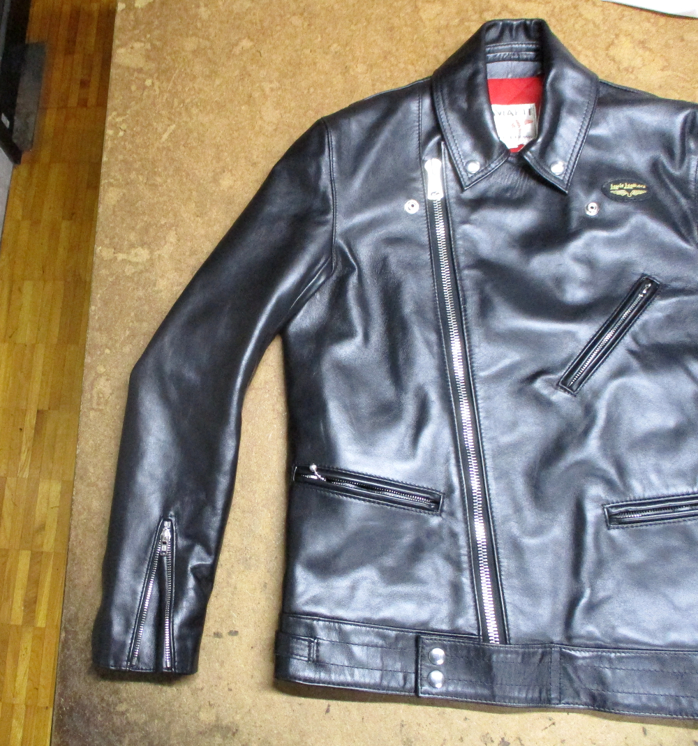 11枚目は12枚目との比較で袖丈を短く腕の幅を細くする前のライダースジャケットです。