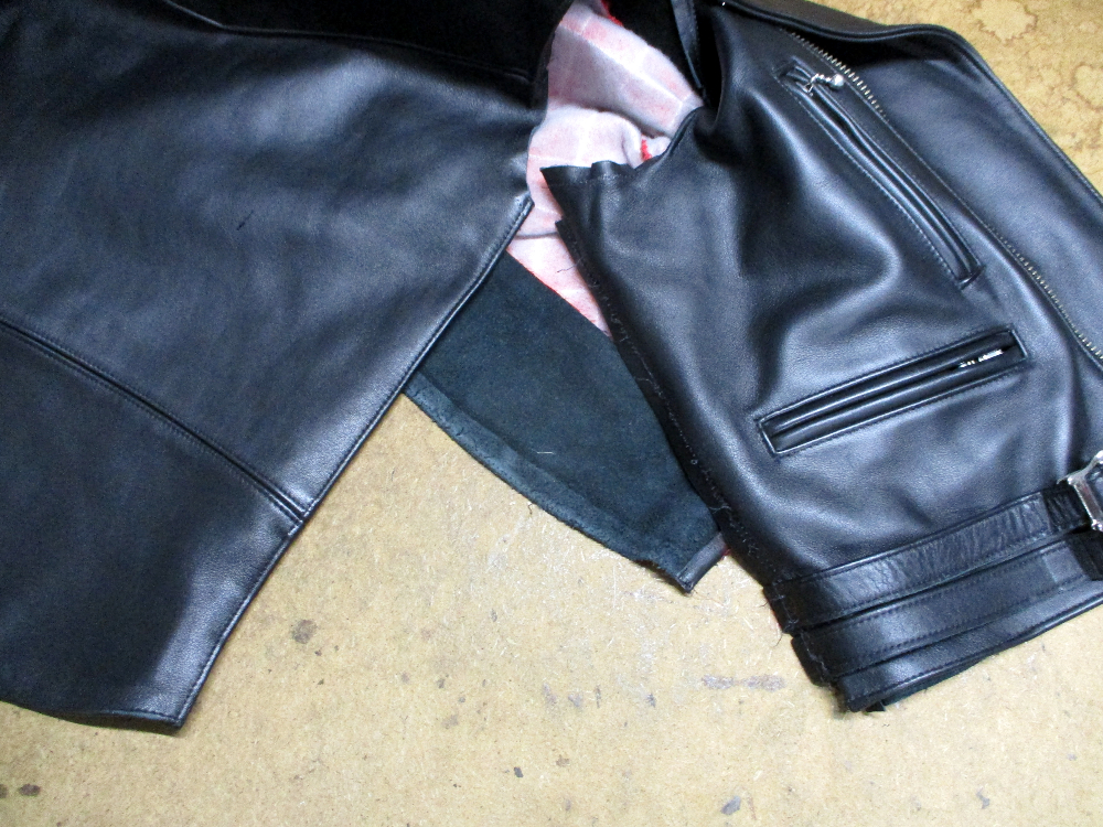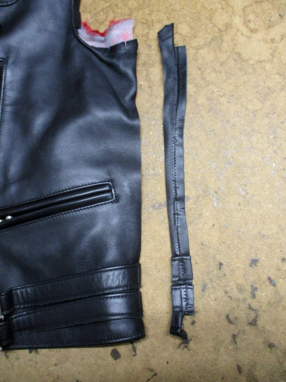 ショットのライダースジャケットの長い袖丈を短く修理していきます。…