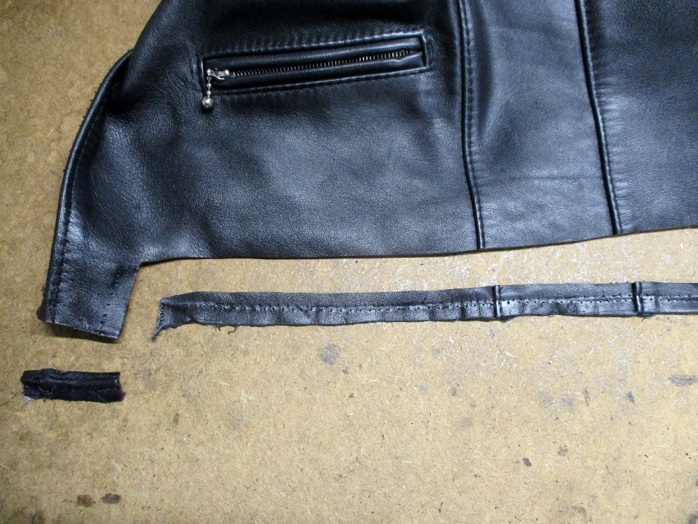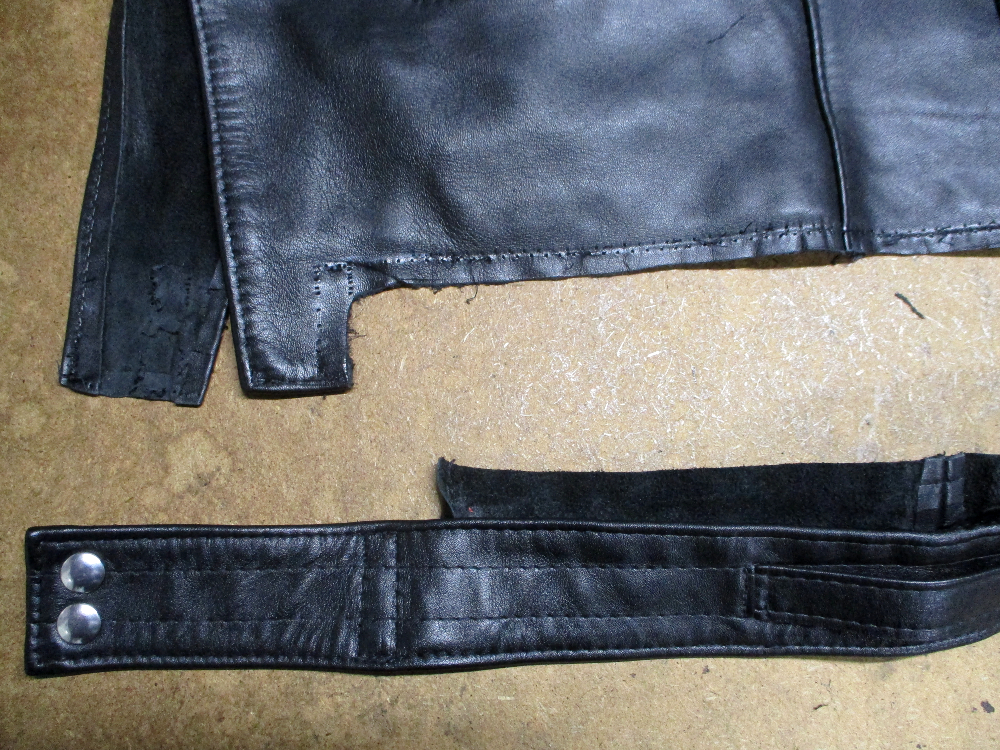 2枚目はフロントのファスナーを取り外して裾の帯のパーツをばらして帯上のレザーをカットして着丈を短くしていきます。
