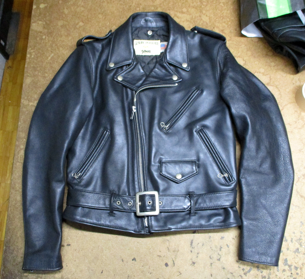 1枚目は北海道からの郵送のお客さんの長い袖丈を短くしていく前のショットのライダースジャケットです。