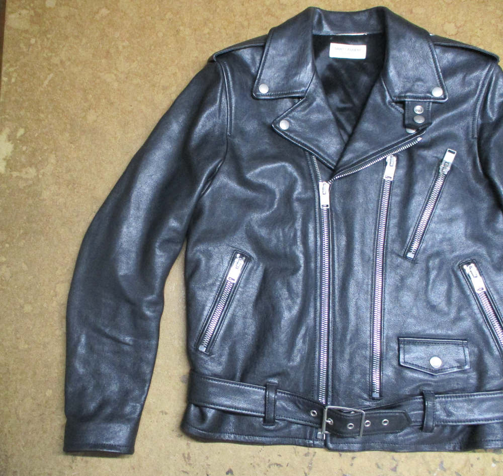 サンローランの長い袖丈のライダースジャケットをお客さんの好みの長さに短くリサイズしていきます。