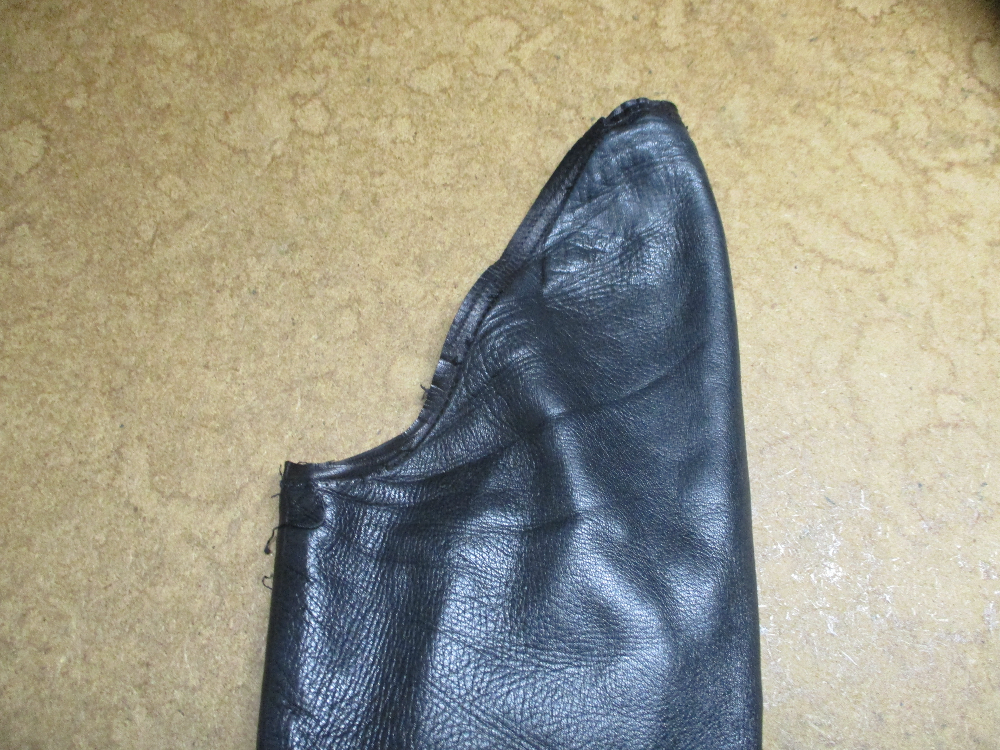 4枚目は表のレザー部分の袖山をカットして長い袖丈を短くしていきます。