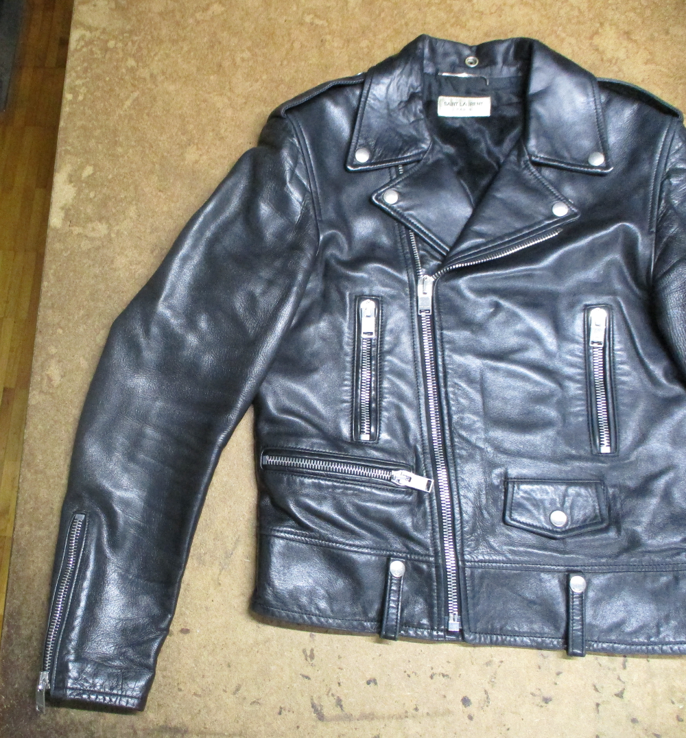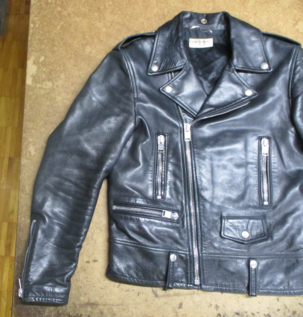 長い袖丈のサンローランのライダースジャケットをお客さんの好みの長さに短くリサイズしていきます。