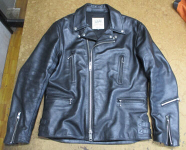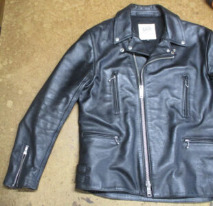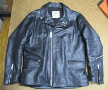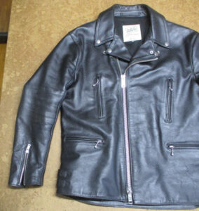 9枚目は10枚目つの比較で肩口から袖丈を短く仕上げていく前のライダースジャケットです。