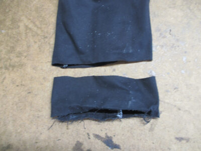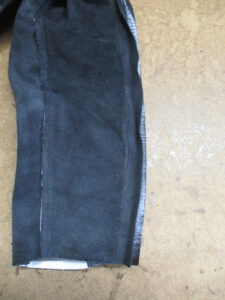12枚目は裏地の袖先の生地も表のレザー部分と同じ長さをカットしていきます。