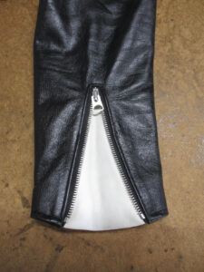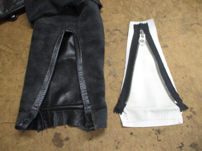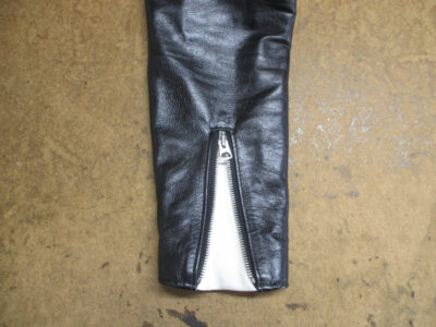 10枚目はファスナーのパーツを取り付けて袖先のレザーをカットして広がった袖先の幅を元の幅に戻していきます。