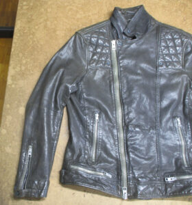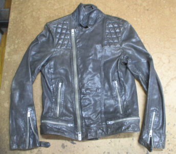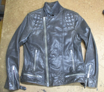 1枚目は来店されたお客さんで作業終了後に兵庫県にジャケットを送る袖丈を短くしていく前のライダースの写真です。